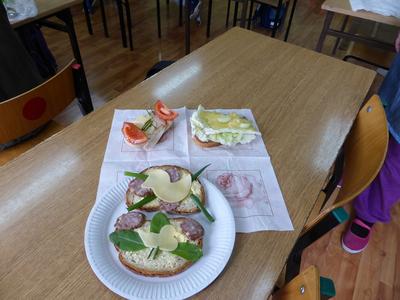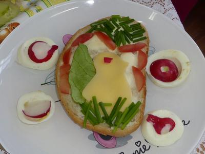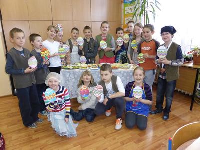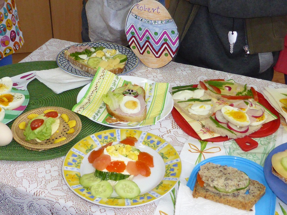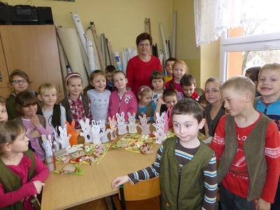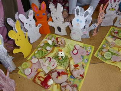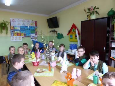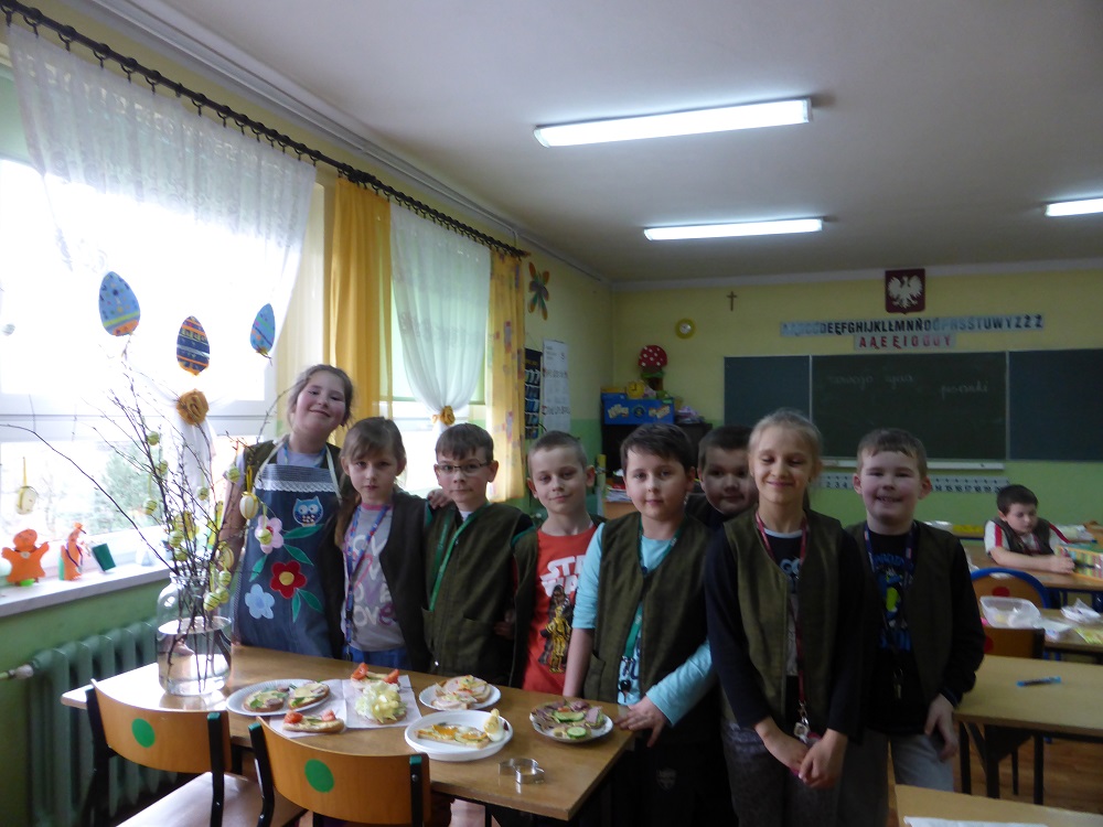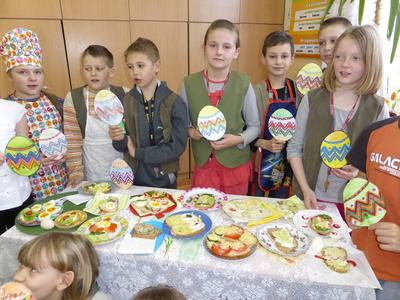Kolejnym działaniem podejmowanym przez uczniów klas I-III było zaaranżowanie spotkania, przygotowanie wielkanocnego stołu oraz wykonanie świątecznej kanapki. Wszystkie młodsze klasy od samego rana z ochotą podjęły się wyznaczonych zadań. Na wstępie dzieci dyskutowały o tradycjach wielkanocnego stołu, dekoracjach, higienie i kulturze zachowania się przy stole oraz wartościach odżywczych poszczególnych składników kanapki. Przewodnimi elementami dekoracyjnymi poszczególnych stołów były własnoręcznie wykonane ,,śniadaniowo - wielkanocne wizytówki” w postaci: jajka-pisanki, zajączka i kaczuszki. Kompozycje te skutecznie ustroiły wielkanocne stoły tym bardziej, że dominowały kolory wiosny i budzącego się życia. Wykonane kanapki także miały elementy poszczególnych wizytówek. Dzieci w czasie pracy wykazały się dużą pomysłowością, aktywnością i zaangażowaniem. W miłej i sympatycznej atmosferze uczniowie poszczególnych klas usiedli do wspólnego wielkanocnego śniadania.