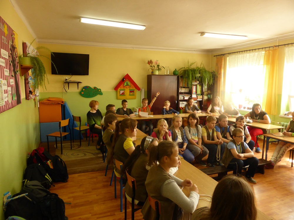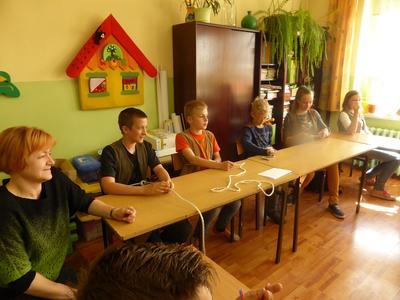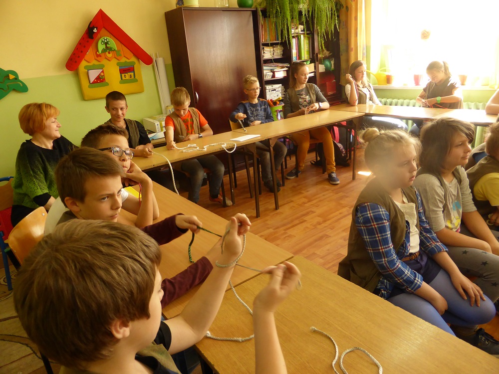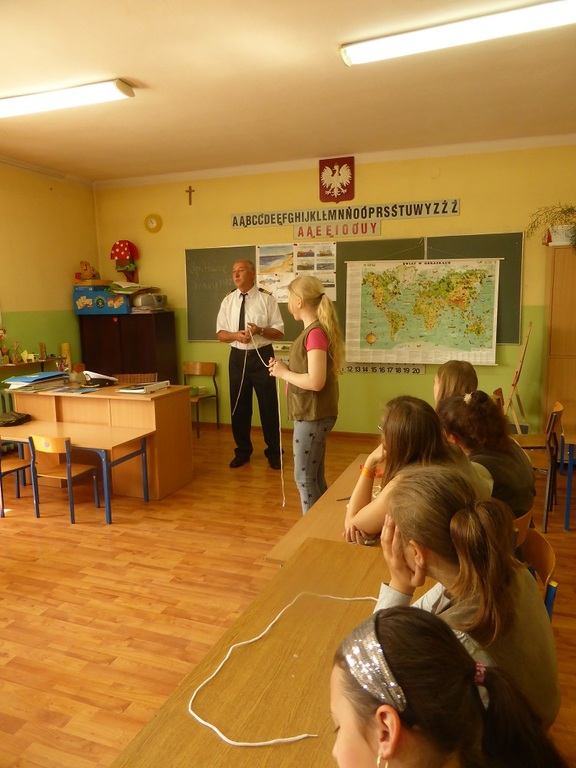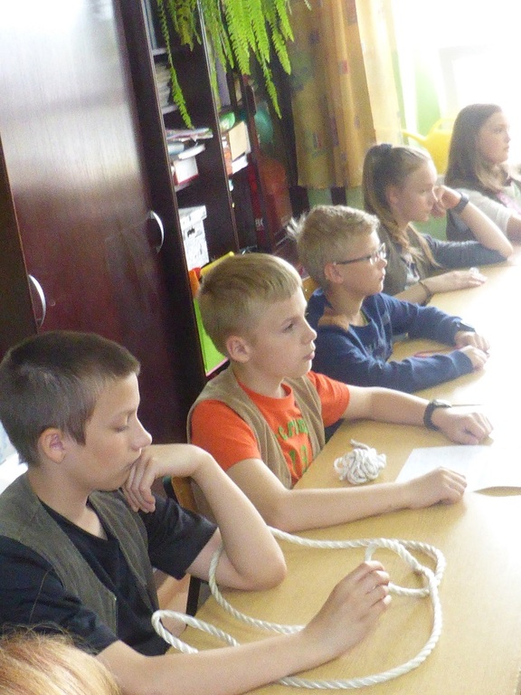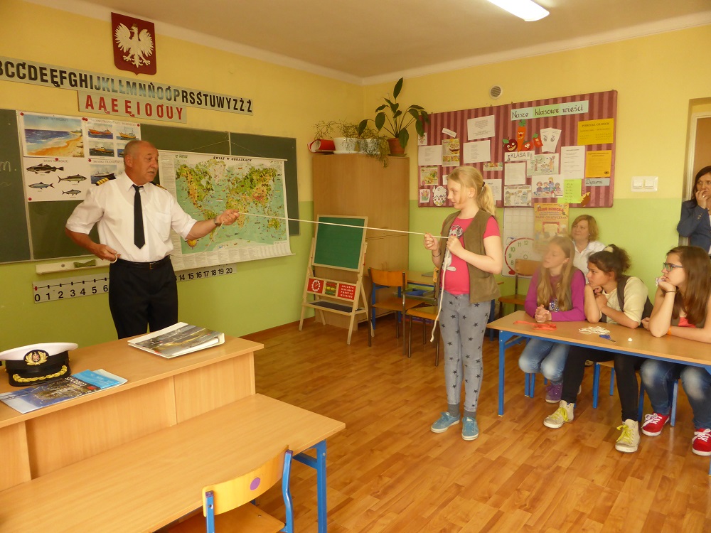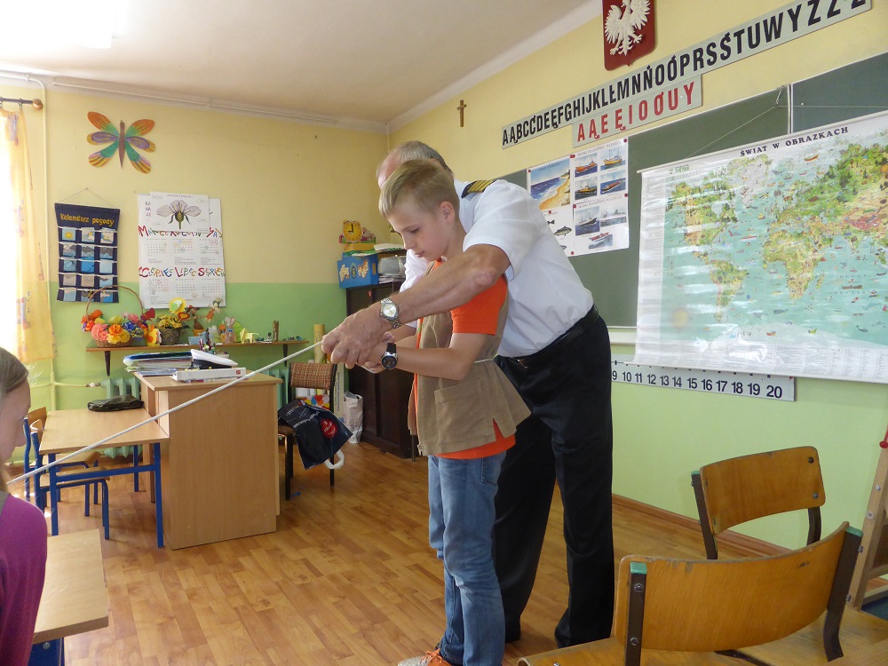 Kulminacyjnym punktem spotkania była nauka wiązania węzłów marynarskich, która niektórym uczniom sprawiła niemałe trudności. Efektem tego niezwykłego ćwiczenia, już po spotkaniu z gościem, było zorganizowanie przez dzieci zawodów - ,,kto najszybciej zawiąże węzeł bezpieczeństwa".