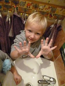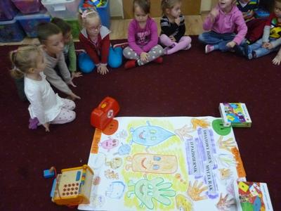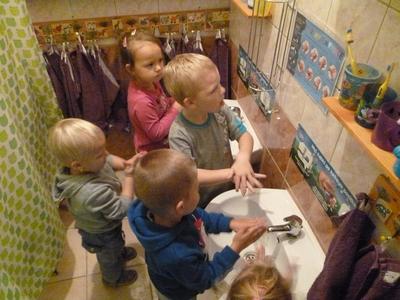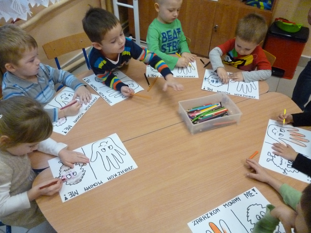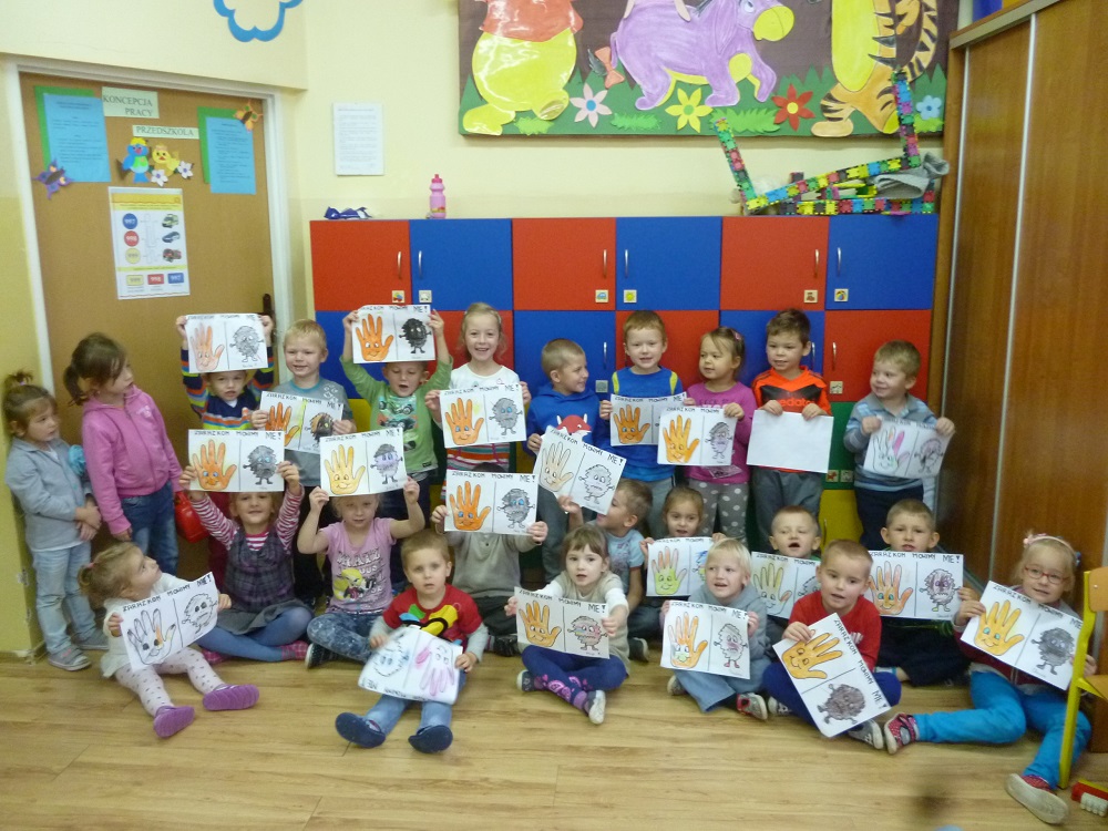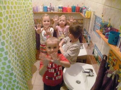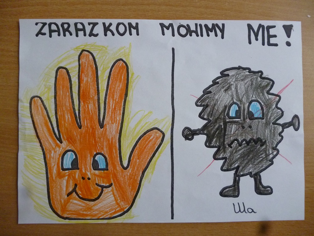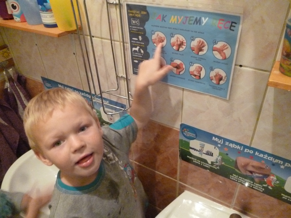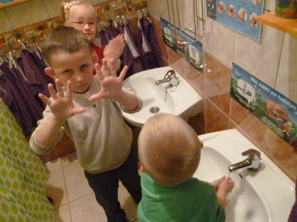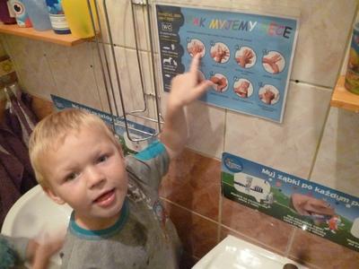 Mycie rąk jest najłatwiejszym sposobem na pozbycie się drobnoustrojów z rąk i zapobiega ich przenoszeniu. Każdy centymetr kwadratowy skóry człowieka może pomieścić tysiące, a nawet miliony drobnoustrojów, a brak nawyku starannego mycia rąk wodą z mydłem prowadzić może do zarażenia się różnymi chorobami. Mając więc na uwadze pozytywne aspekty dbania o higienę w naszym przedszkolu codziennie zwracamy uwagę na to, aby dzieci myły porządnie swoje rączki. Często rozmawiamy z dziećmi na temat znaczenia, jakie ma dla zdrowia częste i dokładne mycie rąk. Stosujemy w praktyce schemat mycia rąk, który umieszczono w widocznym miejscu w naszej łazience. A z okazji Światowego Dnia Mycia Rąk każde dziecko wykonało plakat „Zarazkom mówimy NIE”.