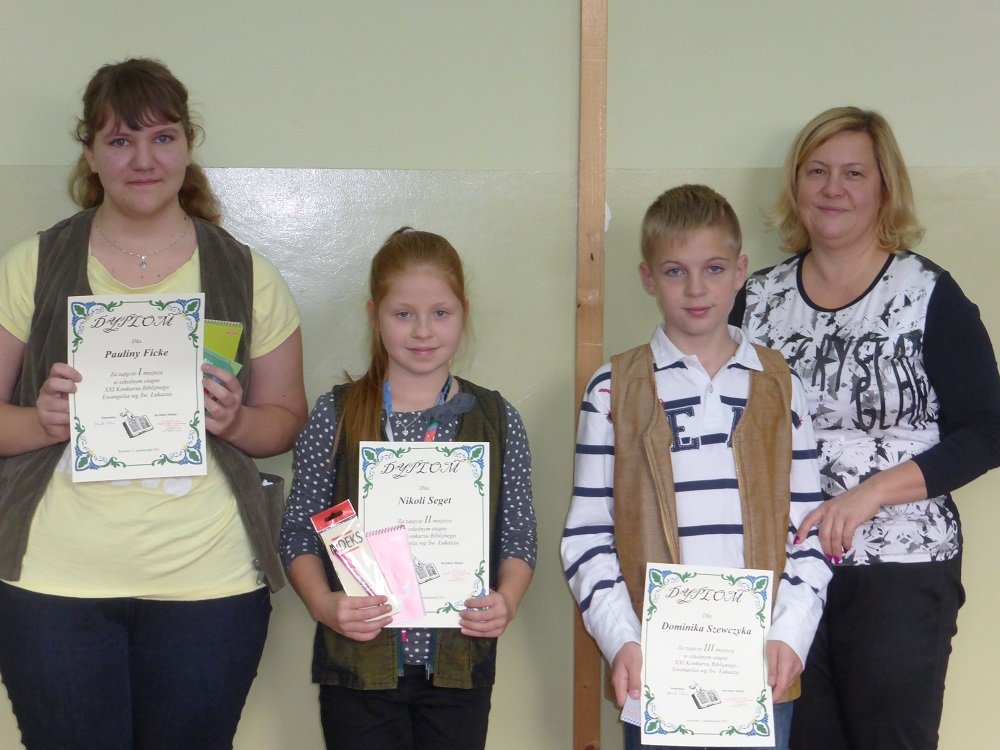 21 października 2015r. w Szkole Podstawowej w Rzuchowie został przeprowadzony etap szkolny XXI Konkursu Wiedzy Biblijnej opartego na treści Ewangelii wg św. Łukasza. Organizatorem konkursu są wydziały katechetyczne diecezji: bielsko - żywieckiej, częstochowskiej, gliwickiej, katowickiej, sosnowieckiej, diecezjalni doradcy metodyczni religii i lokalne wydziały edukacji. Główny cel konkursu to: poznanie Ewangelii wg św. Łukasza, ukazanie wartości Pisma Świętego w życiu człowieka, pogłębienie wiary i kształtowanie chrześcijańskich postaw w oparciu o poznane Słowo Boże, zachęcanie do większego zainteresowania i aktywności na lekcjach religii i w życiu szkoły. Test, który zawierał 25 zadań, pisało łącznie 11 uczniów z klasy V i VI. Na rozwiązanie zadań mieli 45 minut. Do następnego etapu - rejonowego przeszło troje najlepszych uczestników z naszej szkoły: I miejsce - Paulina Ficke, II - Nikola Seget, III - Dominik Szewczyk. Laureatom gratulujemy i życzymy dalszych sukcesów w kolejnym etapie konkursu, który odbędzie się już 19 listopada.