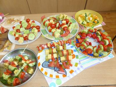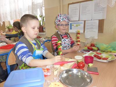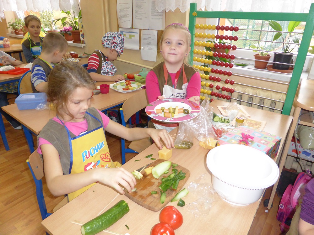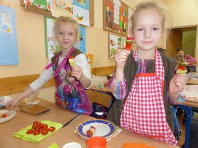 Niemałe znaczenie w tej kwestii miał także wygląd przygotowanych przystawek, a były to: witaminowe koreczki pomidorowe (w kl.I), pomidorowy stworek (w kl.II), ,,kanapka króla pomidora" (w kl.III). Inwencja i pomysłowość dzieci w trakcie kulinarnych dokonań była bardzo bogata i twórcza. W tym dniu szczególnie zwróciliśmy uwagę na pochodzenie pomidorów, wartości odżywcze, kaloryczne, smakowe i zdrowotne, a także na higienę i sposoby przechowywania warzyw. Dzieci czytały wiersze, rozwiązywały różne zadania, zagadki i łamigłówki ,,zdrowotne". Po wspólnie zjedzonym posiłku uczniowie wykonali dla pomidora królewską koronę.