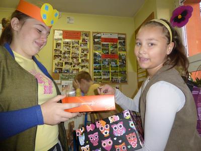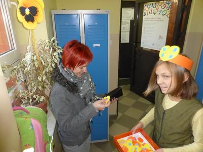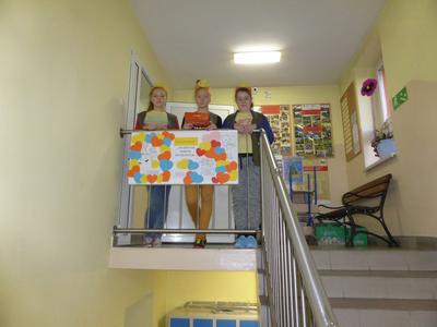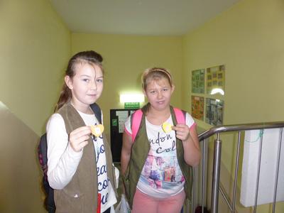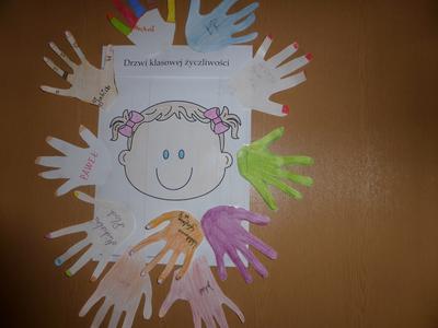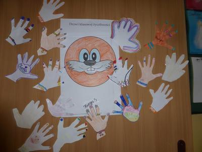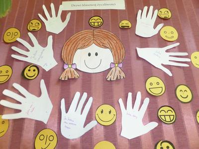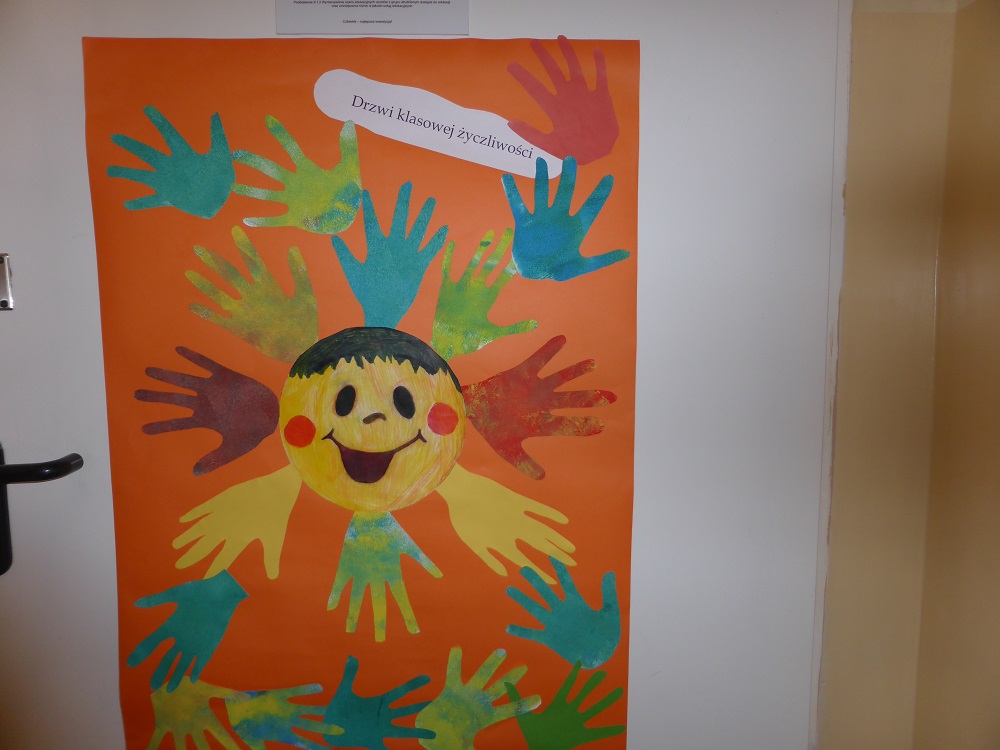 Wszyscy przybywający - dzieci, pracownicy, nauczyciele i rodzice zostali na wstępie poczęstowani przez uczennice SK PCK ,,sercem życzliwości", dobrym słowem i promiennym uśmiechem. Każdy uczeń miał na sobie element garderoby w kolorze żółtym i pomarańczowym. Natomiast ściany i drzwi klas zostały ozdobione pracami plastycznymi z hasłem - ,,Drzwi klasowej życzliwości".