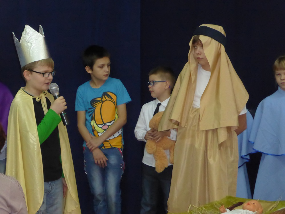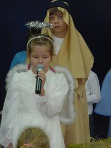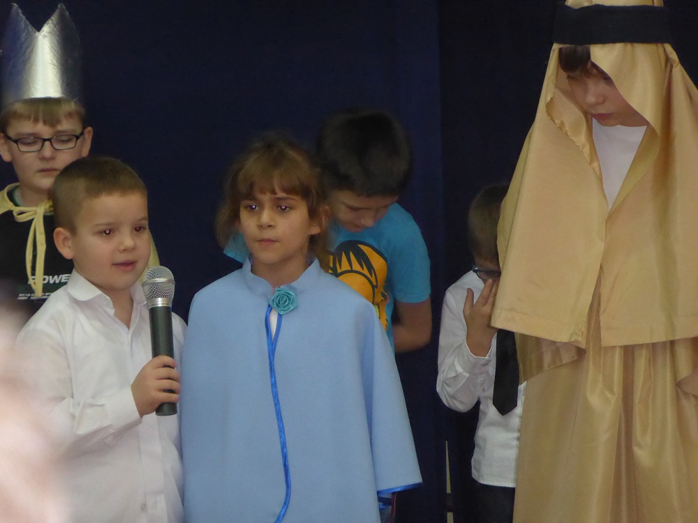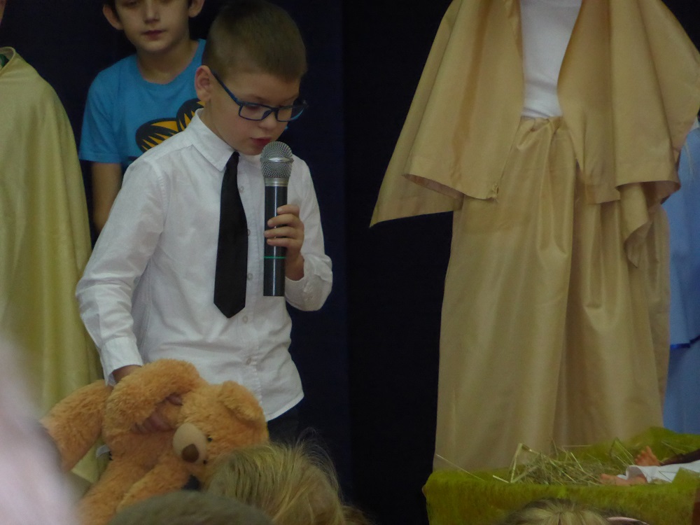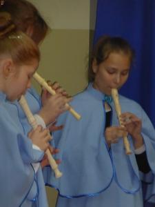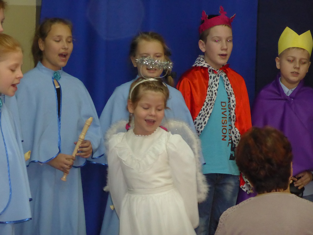 Zespół flecistów z klasy piątej zagrał wersję instrumentalną kolędy pt. „Anioł pasterzom mówił”. Uczennica kl. V zagrała na keyboardzie melodię pt. „Cicha noc”. Na zakończenie dzieci zaśpiewały rytmiczną pastorałkę pt. „Aniołek Maleńki” oraz piosenkę świąteczną w języku angielskim pt. „O Christmas Tree”.