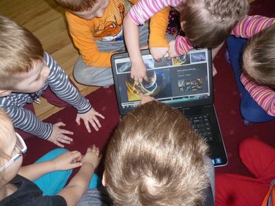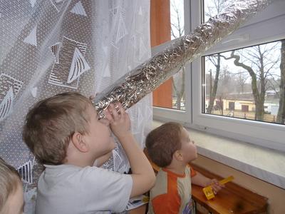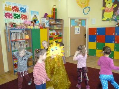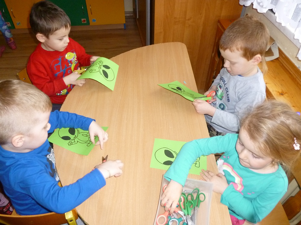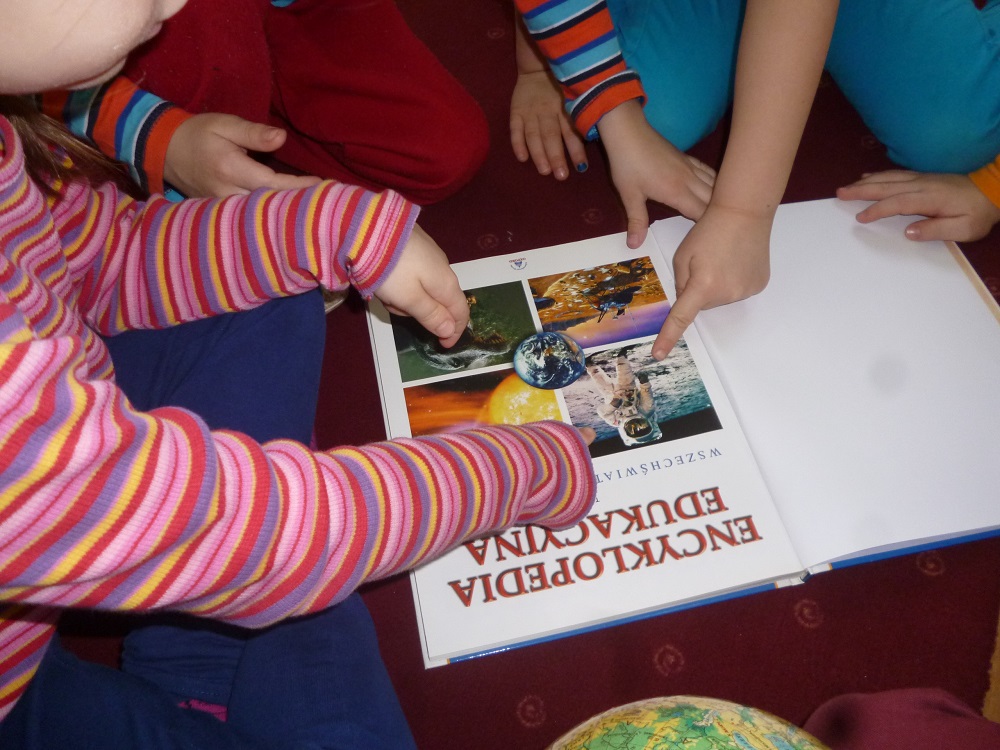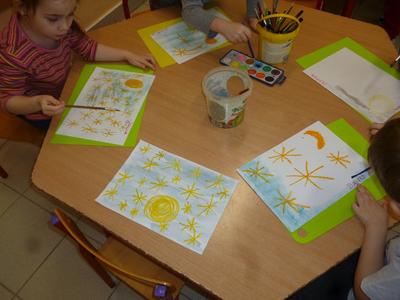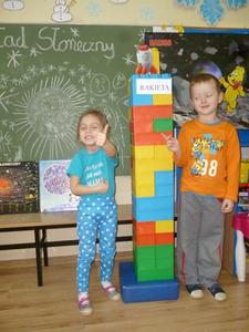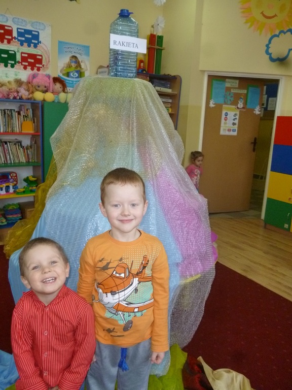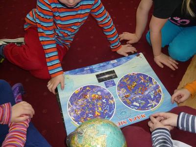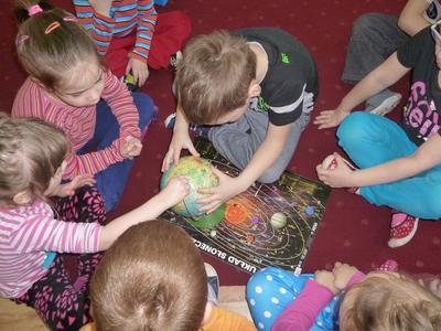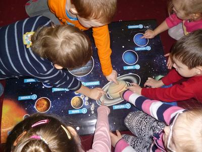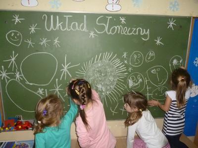W drugim tygodniu ferii nasze przedszkolaki wcielały się w rolę astronautów i razem z Misiem Haribo przemierzały przestrzeń kosmiczną w poszukiwaniu wiedzy, niecodziennych przygód i dobrej zabawy. Mali astronauci poznali Układ Słoneczny – odwiedzili Słońce i 8 planet wchodzących w jego skład. Dotarli nawet poza granice Układu Słonecznego, gdzie znajduje się sonda Voyager wysłana w Kosmos w 1977 roku. Dzięki bajkom i opowieściom Misia dzieci dowiedziały się, jak wyglądają planety należące do Układu Słonecznego, jaka jest ich wielkość, odległość między nimi, jakie panują na nich warunki, a także – czy możliwe jest na nich życie. Dzieci budowały rakiety i łaziki z klocków i innych dostępnych materiałów, rysowały kredkami oraz kredą kolejno poznawane planety, malowały farbami gwiazdy, wykonały z masy solnej kosmiczne ciasteczka, liczyły księżycowe kamienie, uczyły się rymowanki o słonku, spotkały się z ufoludkami, a potem bawiły się w sali gimnastycznej i na boisku oraz spacerowały w okolicy przedszkola obserwując przy tym niebo. W ostatnim dniu ferii dzieci wykonały prace plastyczne na ogólnopolski konkurs pt. „Kosmos w oczach dziecka”. Tak więc cały tydzień dzieci pracowały razem na wspólny cel, integrowały się i rozwijały poprzez zabawę swoją wiedzę na temat Kosmosu.