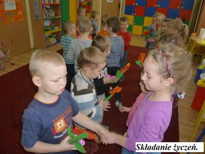 Dzień Kobiet to wyjątkowy dzień, ważny dla wszystkich kobiet, zarówno tych dużych, jak i małych. W tym szczególnym dniu przedszkolaki słuchały piosenki „Dzień Kobiet”, uczyły się wierszyka „Dzień ósmy marca”, tworzyły kwiaty z kolorowego papieru oraz zrobiły piękną laurkę dla mamy. Następnie chłopcy złożyli wszystkim dziewczynkom i paniom życzenia oraz wręczyli drobne upominki. Nie obyło się także bez słodkiego poczęstunku zorganizowanego przez rodziców. Cały dzień upłynął nam na tańcach, śpiewie i zabawie.