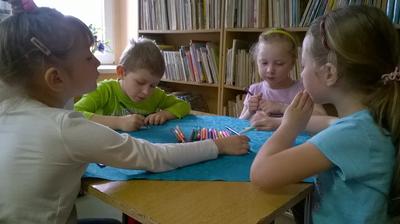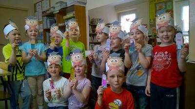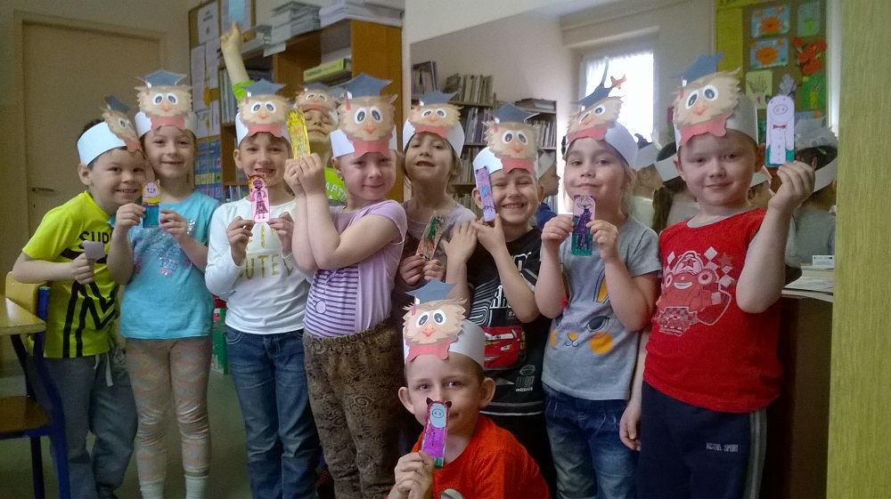 Sześcioletnie przedszkolaki zostały zaproszone w kwietniu na zajęcia do szkolnej biblioteki. Dzieci oglądając krótką prezentację, mogły dowiedzieć się, jak powstaje książka. Odpowiadały na pytania dotyczące biblioteki. Same, według własnych pomysłów, wykonały proste zakładki do książek. Wysłuchały kilku wierszy na temat literek. Na zakończenie zajęć każde dziecko, za udzielanie prawidłowych odpowiedzi do pytań i zagadek, otrzymało koronę „Sowy – mądrej głowy”. Zajęcia biblioteczne przebiegały w luźnej, wesołej atmosferze.