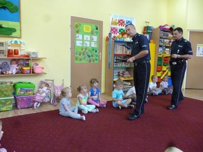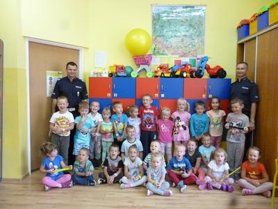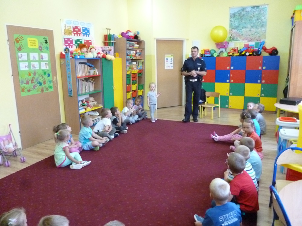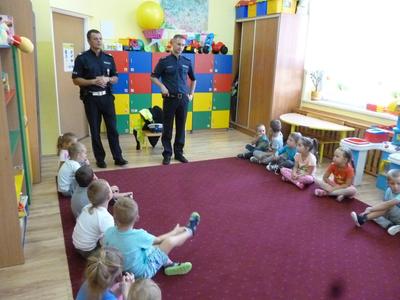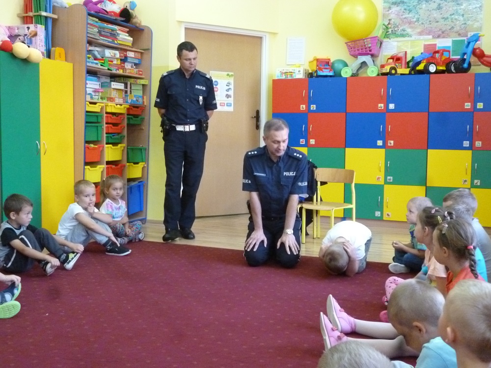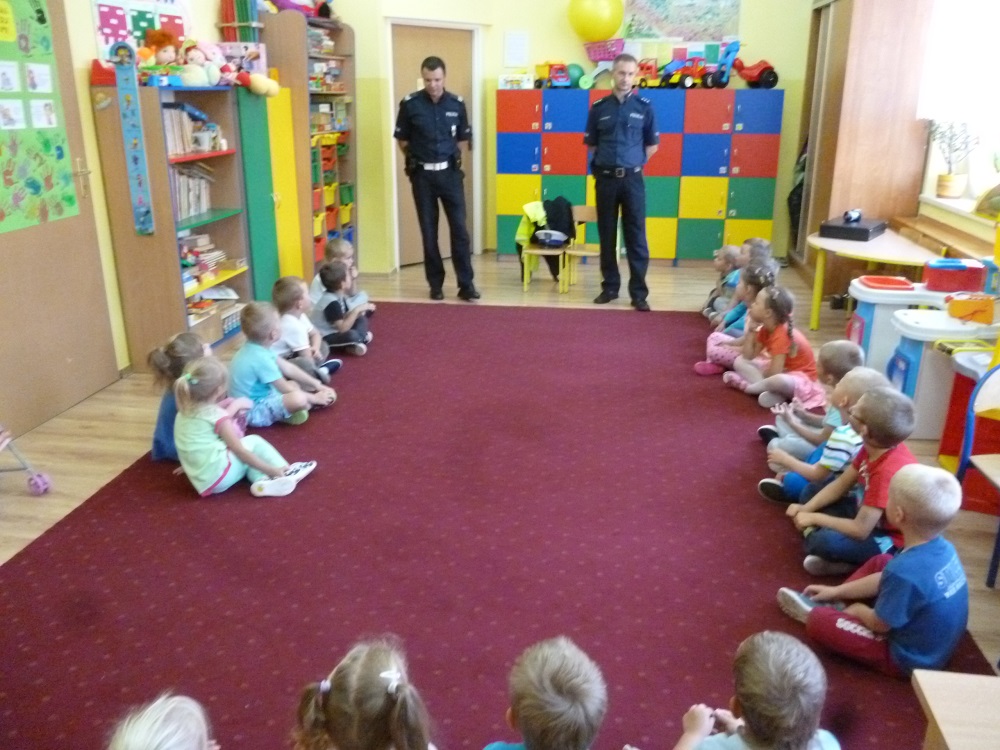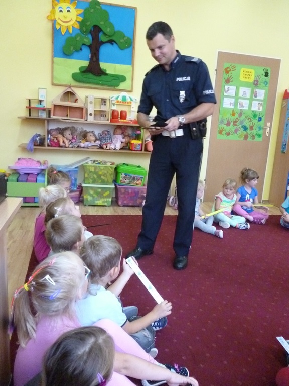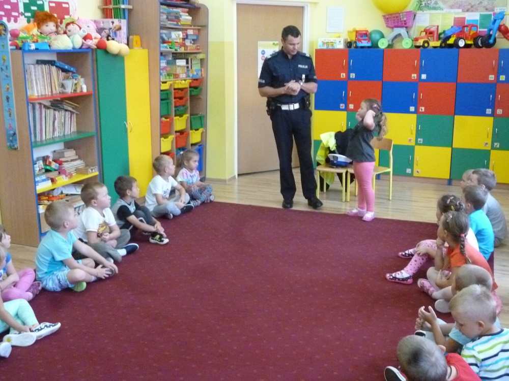 7 września nasze przedszkole odwiedzili policjanci, którzy w ciekawy sposób omówili zasady ruchu drogowego dotyczące prawidłowego i bezpiecznego poruszania się po ulicach. Następnie uzmysłowili nam, z jakich bezpiecznych gadżetów powinny dzieci korzystać jeżdżąc na rowerze bądź spacerując o zmierzchu. Przy tej okazji rozdali także wszystkim odblaski, abyśmy byli bardziej widoczni na drodze. Ponadto funkcjonariusze policji krok po kroku zaprezentowali pozycję „żółwia”, która minimalizuje ewentualne uszkodzenia ciała podczas ataku psa. Przedszkolaki z dużym zainteresowaniem słuchały rad i wskazówek zaproszonych gości. Na zakończenie dzieci podziękowały policjantom za poświęcony czas oraz wręczyły im laurkę. Po spotkaniu przedszkolaki utrwaliły zdobytą wiedzę podczas spaceru, gdzie prawidłowo przeszły przez jezdnię i odpowiednio zachowywały się w jej pobliżu.