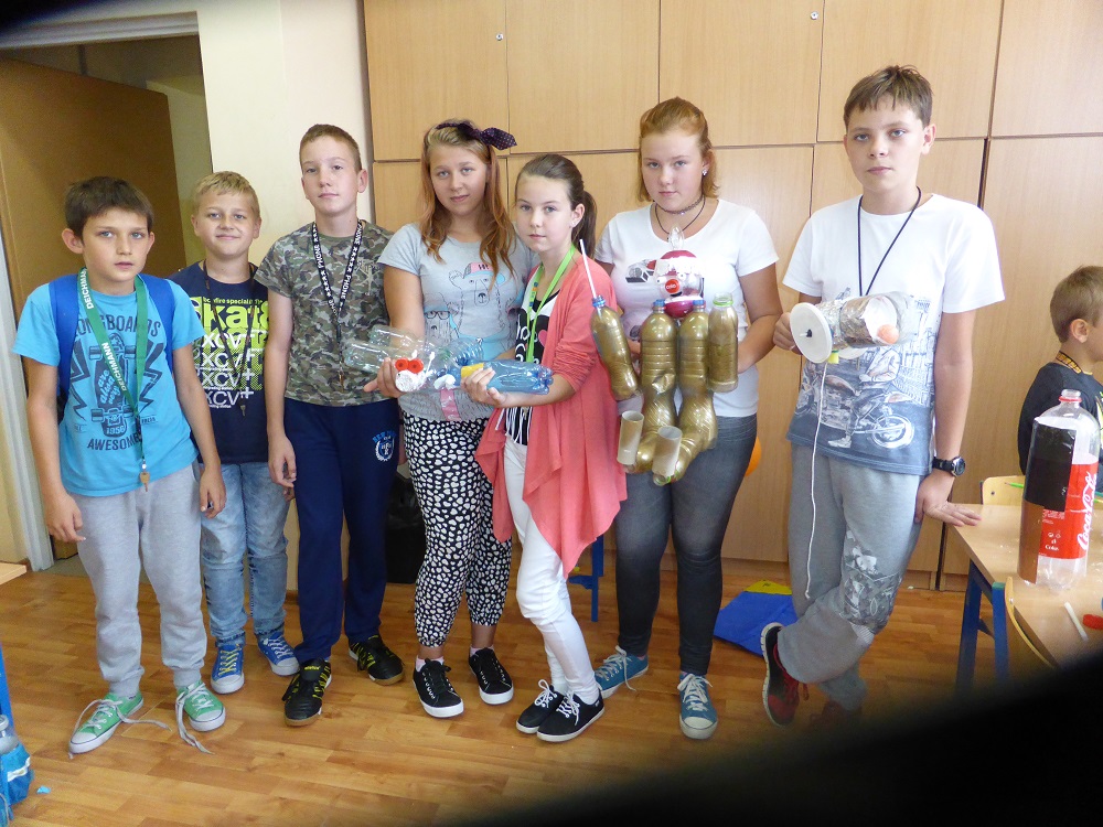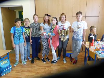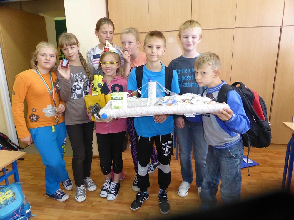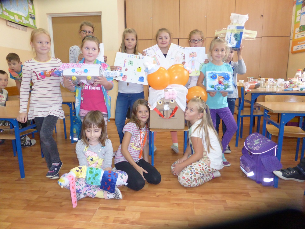 Dnia 19.09.2016r. w naszej szkole odbyła się akcja „Sprzątanie świata” pod hasłem: „Podaj dalej… drugie życie odpadów”. W ramach tego wydarzenia każda klasa, wraz ze swoim wychowawcą, wykonała dowolny przedmiot z surowców wtórnych. Powstały więc: samoloty, roboty, kolorowe gąsienice, a nawet jeżyk. Dzieci bardzo chętnie pracowały, a ich dzieła zostały uwiecznione na zdjęciach. Uczniowie wysłuchali także krótkiej pogadanki na temat potrzeby segregowania odpadów, utrwalili pojęcie recyklingu. Rozwijanie u dzieci takich postaw ma ogromny wpływ na naszą przyszłość, zdrowie oraz środowisko naturalne.