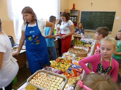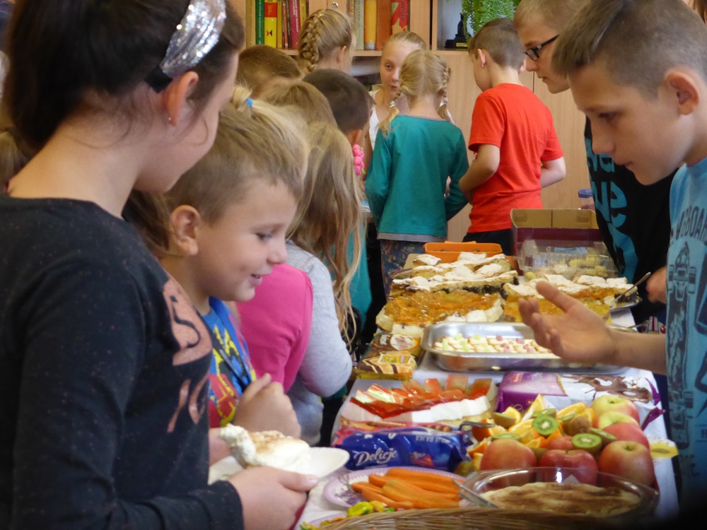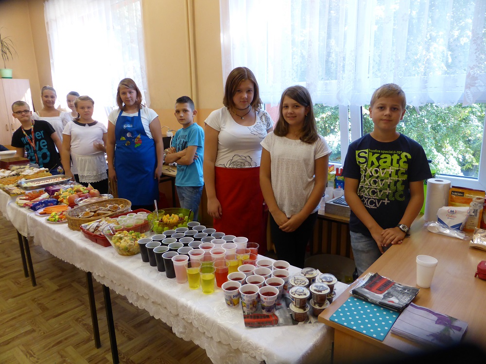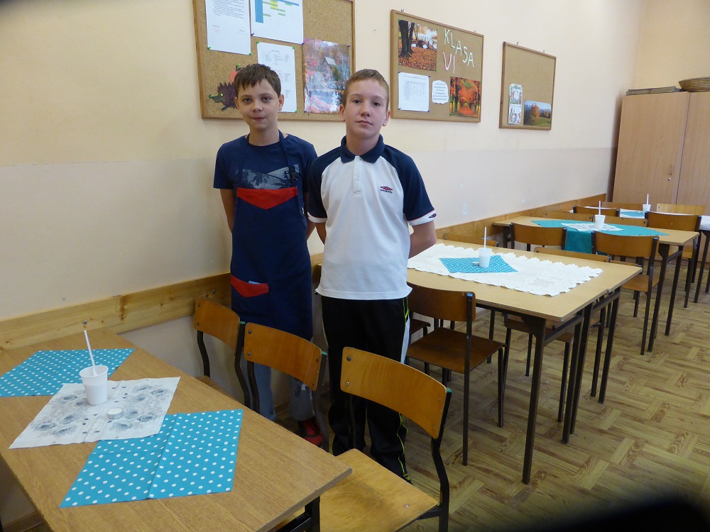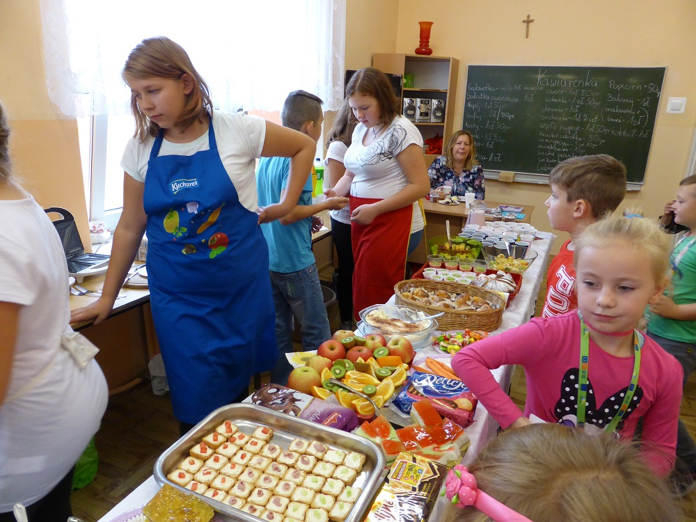 W środę 28 września uczniowie klasy szóstej wraz z wychowawcą przygotowali klasową kawiarenkę, do której zaprosili wszystkich młodszych kolegów - przedszkolaków i uczniów klas I – V. Szóstoklasiści przy pomocy rodziców przygotowali szereg potraw. Odwiedzający kawiarenkę goście mogli spróbować kanapek, gofrów, galaretek, ciast, ciasteczek, koktajli, soków owocowych, sałatek z owoców i innych smakołyków. Najstarsi uczniowie szkoły świetnie sprawdzili się w roli kucharzy i kelnerów. Rodzicom szóstoklasistów serdecznie dziękujemy za pomoc w organizacji szkolnej kawiarenki.