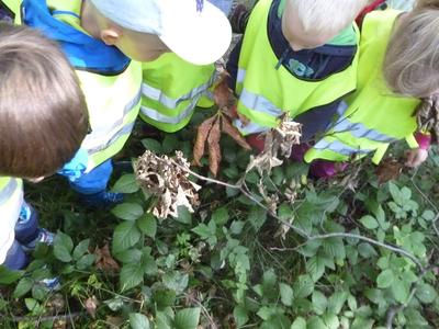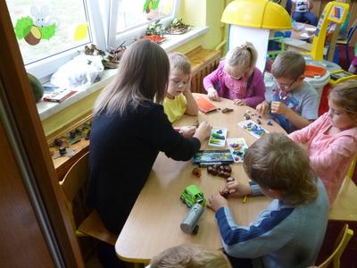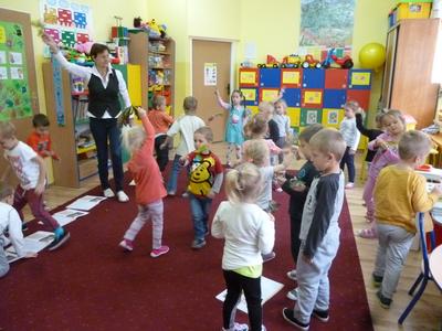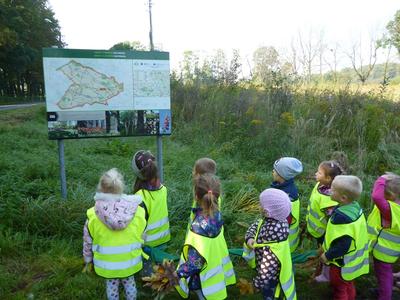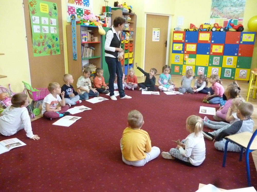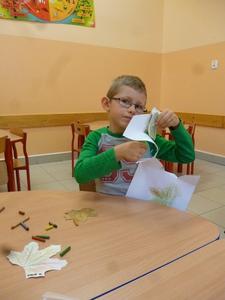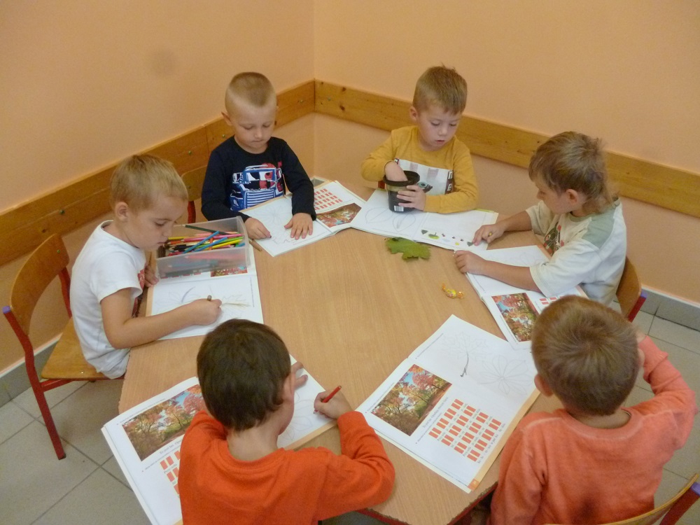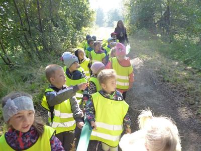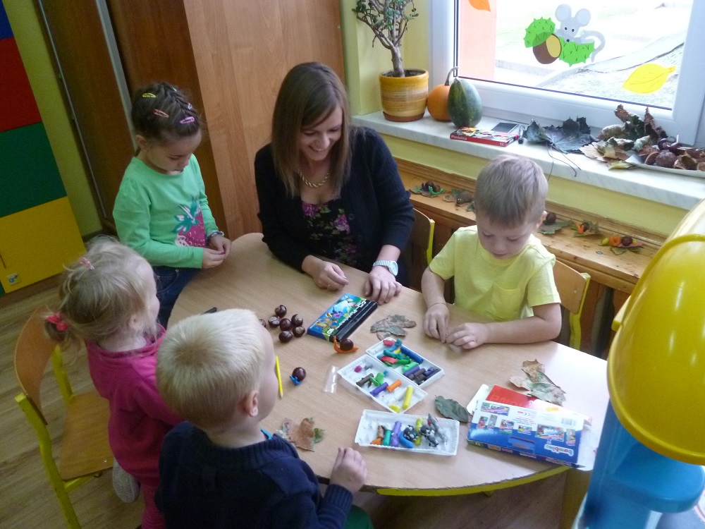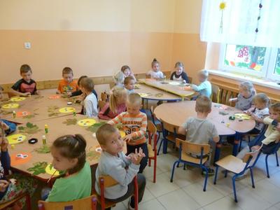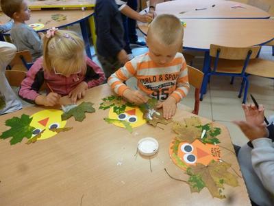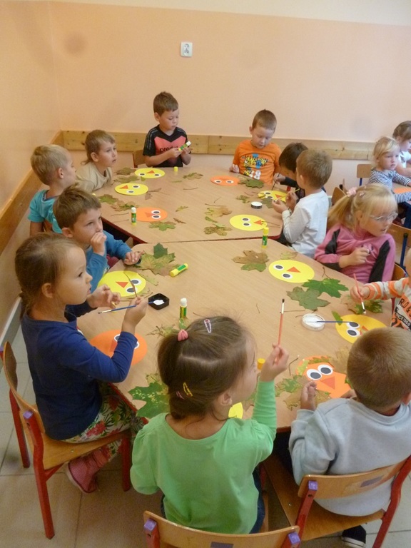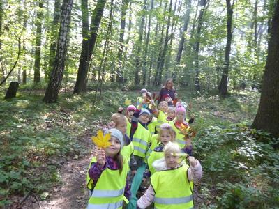 W poniedziałek 26 września przedszkolaki wybrały się na wycieczkę do pobliskiego lasu, gdzie podziwiały piękno polskiej jesieni. Dzieci miały okazję pozbierać dary jesieni do przedszkolnego kącika przyrody (liście, kasztany, żołędzie), a także posłuchać głosów lasu i zaobserwować leśne zwierzęta. Nie zabrakło również grzybów, które klasyfikowały na jadalne i niejadalne. Przedszkolaki nazywały drzewa znajdujące się w lesie oraz przyporządkowywały do nich owoce, tj.: żołędzie, kasztany. W kolejnych dniach dzieci wykonywały prace plastyczne z darów jesiennych zebranych w lesie i parku – sówki z liści, ślimaki z plasteliny i kasztanów oraz liście odbite na kartce papieru jako ozdoba na przedszkolne drzewko. Dużo radości sprawiły im też tańce przy jesiennej muzyce z liśćmi w dłoniach, różnorodne zabawy tematyczne oraz bajka edukacyjna o zwierzętach leśnych.