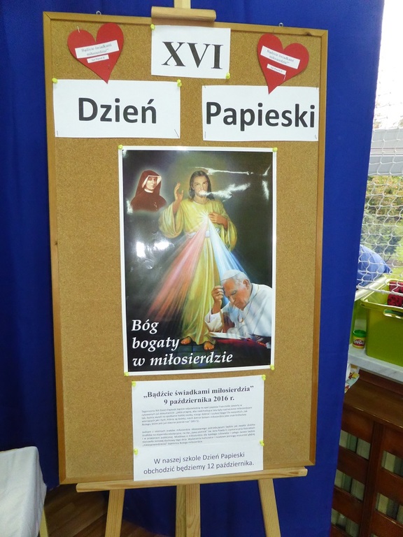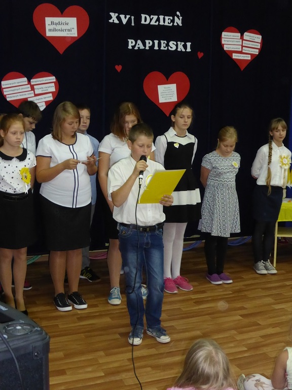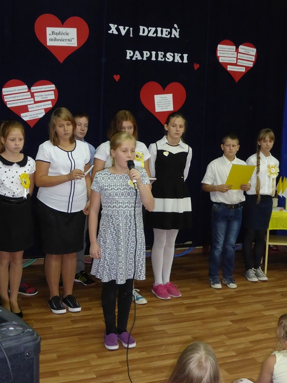 12 października 2016 roku w naszej szkole obchodziliśmy XVI Dzień Papieski pod hasłem "Bądźcie świadkami miłosierdzia - Jan Paweł II". Jak co roku dzień ten to czas, kiedy możemy przystanąć i zatrzymać się nad słowem, które pozostawił dla nas Sługa Boży Jan Paweł II. O godzinie 9.50 sala gimnastyczna była wypełniona po brzegi, dominowały bało-żółte barwy ubrań.