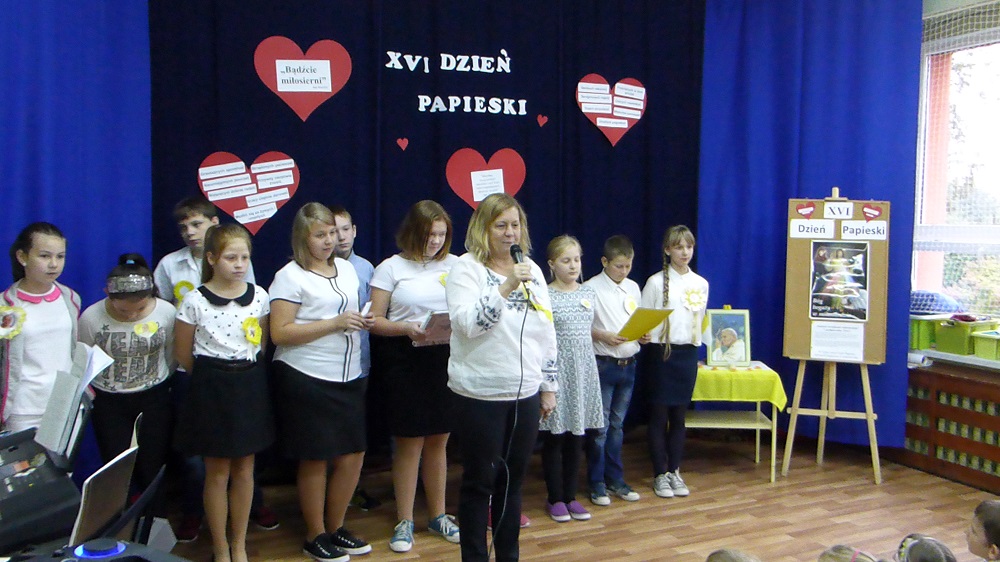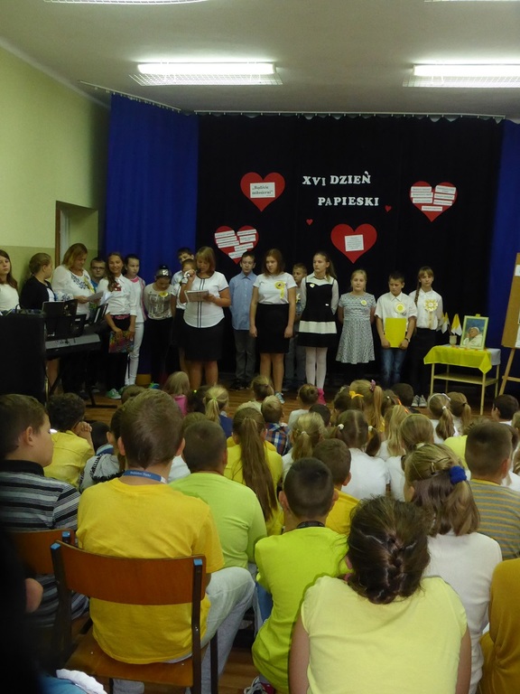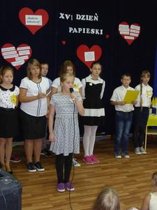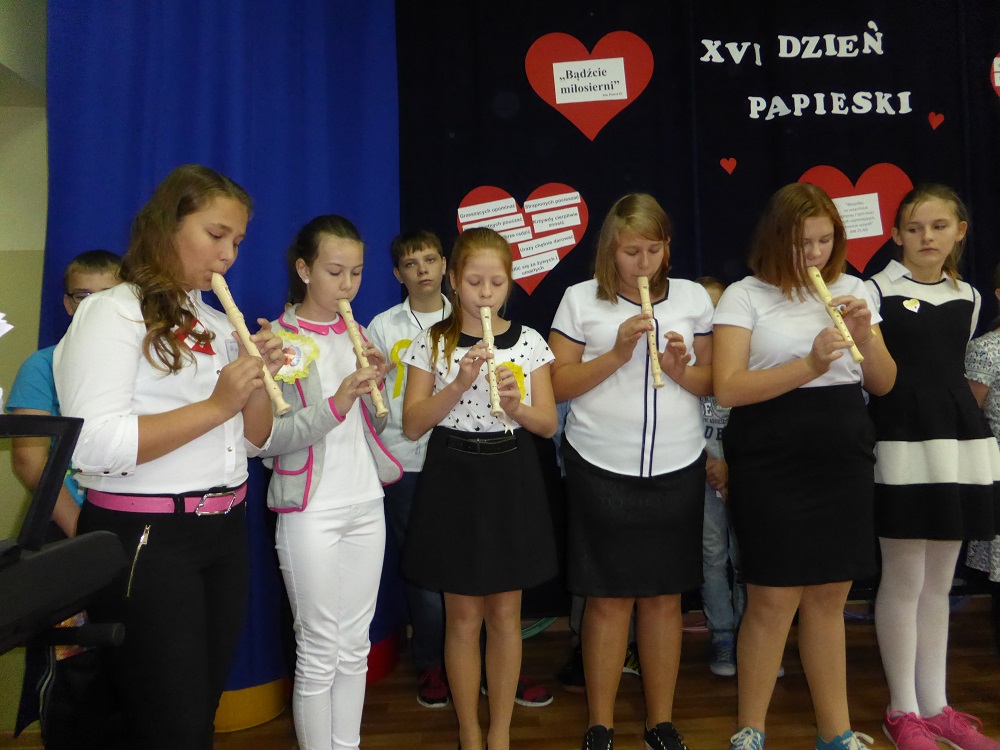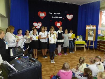 Recytacja wierszy i fragmenty życiorysu Wielkiego Rodaka przeplatały piosenki: "Błogosławieni, miłosierni" i "Trzymaj mnie mocno dziś". Na zakończenie cała społeczność szkolna w postawie stojącej łącząc się duchowo ze Świętym Janem Pawłem II odśpiewała ulubioną pieśń Ojca Świętego "Barka". Natomiast uczennice z klasy VI zagrały tę pieśń na fletach przy akompaniamencie organów.