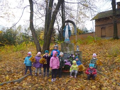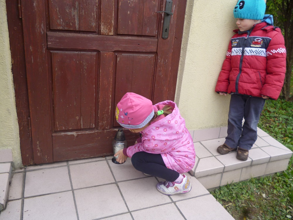 31 października z okazji nadchodzących Wszystkich Świętych dzieci wybrały się pod pomnik poległych w walkach o wyzwolenie ziemi śląskiej, a także do kaplicy świętego Jana Nepomucena, aby zapalić znicze. Przy kaplicy spotkały mieszkającą w sąsiedztwie Panią Mirkę, która opowiedziała dzieciom o tym, jak dawniej ludzie gromadzili się tam na mszach świętych i nabożeństwach majowych. Spacer w miejsca pamięci o zmarłych było wprowadzeniem przedszkolaków w atmosferę związaną z uroczystością Wszystkich Świętych.