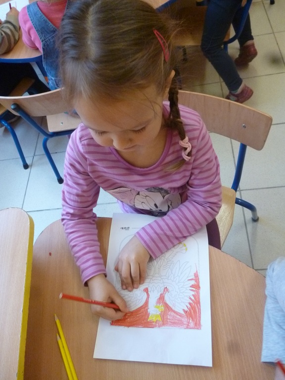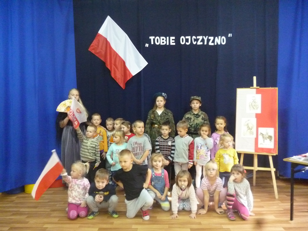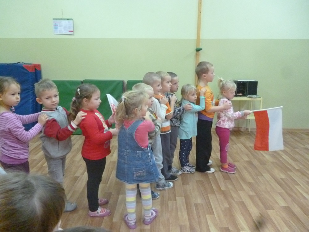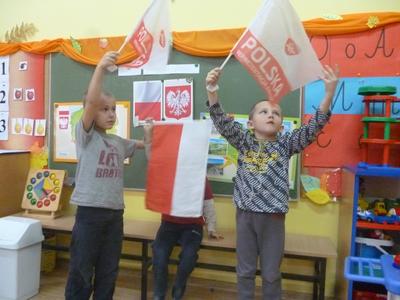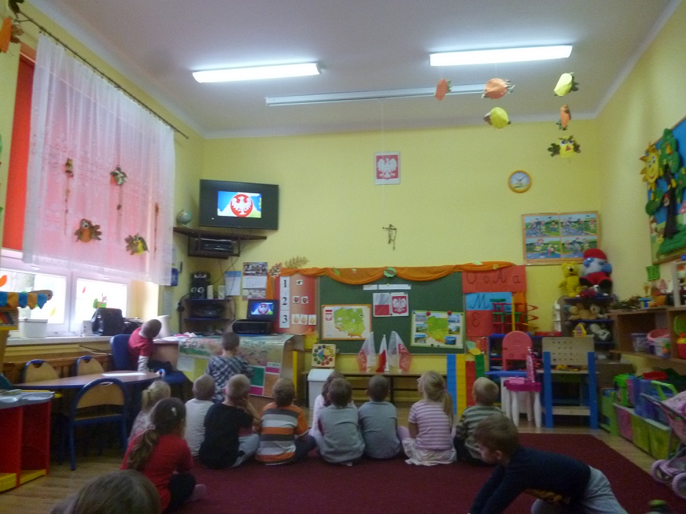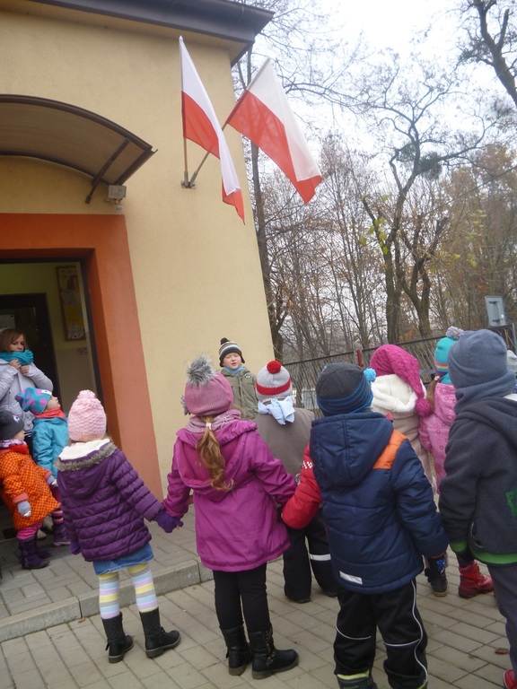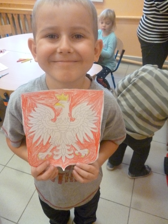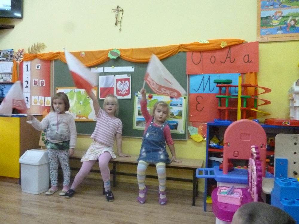 Według podstawy programowej celem wychowania przedszkolnego jest kształtowanie u dzieci poczucia przynależności społecznej (do rodziny, grupy rówieśniczej i wspólnoty narodowej) oraz postawy patriotycznej. Dziecko powinno wiedzieć jakiej jest narodowości, że mieszka w Polsce, powinno nazywać godło i flagę państwową i znać polski hymn. Nasze przedszkolaki w przeddzień narodowego Święta Niepodległości obejrzały film „ Polskie Symbole Narodowe, śpiewały hymn Polski, recytowały wiersz Marii Łaszczuk „Znak”, zapoznały się z mapą Polski i wykonały pracę plastyczną pt. „Godło Polski”. Podczas spaceru szukały polskiej flagi. Przedszkolaki chętnie uczestniczyły w zajęciach.