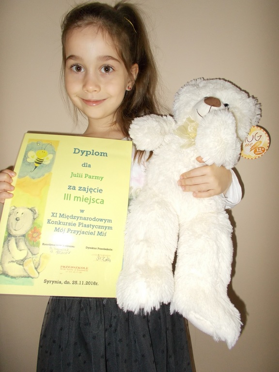 W listopadzie Przedszkole w Rzuchowie wzięło udział w XI Międzynarodowym Konkursie Plastycznym pt.: "Mój przyjaciel miś" organizowanym przez Przedszkole w Syryni. Celem konkursu było rozwijanie kreatywności dzieci i dziecięcych talentów oraz promowanie spontanicznej ekspresji plastycznej dziecka. Prace oceniała niezależna komisja powołana przez organizatorów. Przy ocenie prac najwyżej punktowana była samodzielność wykonania, pomysłowość, stopień trudności i techniki oraz staranność wykonania. Rozstrzygnięcie i uroczyste wręczenie nagród nastąpiło 30 listopada 2016 r. w przedszkolu w Syryni. Nasze przedszkole zdobyło w tym konkursie III miejsce. Prace konkursową wykonała Julia (6 lat), której serdecznie gratulujemy i życzymy dalszych sukcesów.