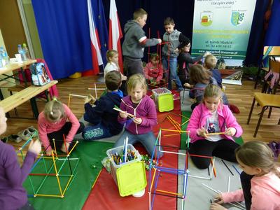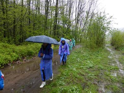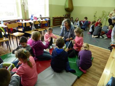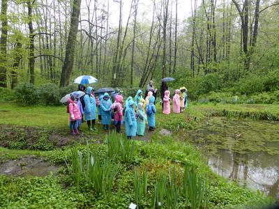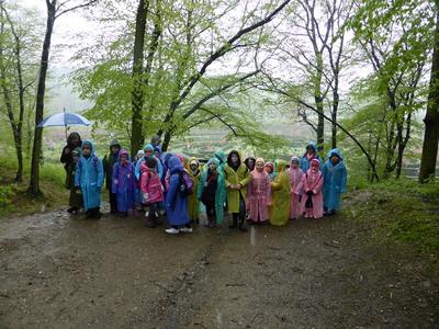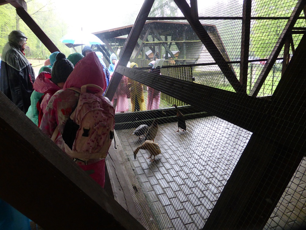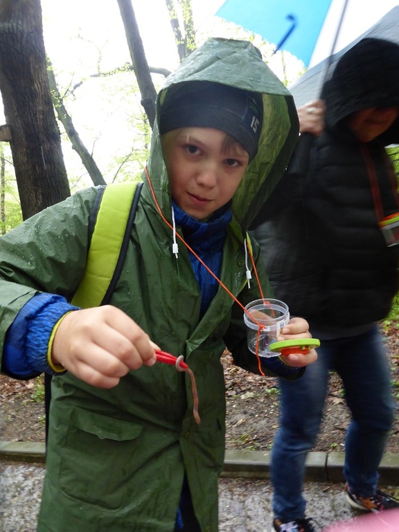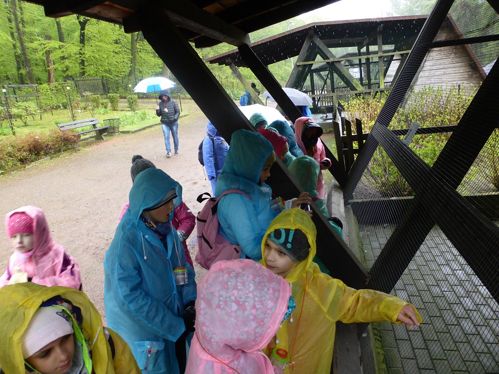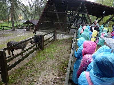 Pomimo niesprzyjającej pogody dzieci z zainteresowaniem zwiedziły Mini Zoo - dom dla przeróżnych zwierzaków, wśród których największą popularnością cieszyły się: kuc szetlandzki, osioł, kaczka z czterema nogami, przepiękny paw i wiele innych. W trakcie spaceru uczniowie obserwowali także dżdżownice - za pomocą specjalnych pojemniczków zaopatrzonych w lupy.