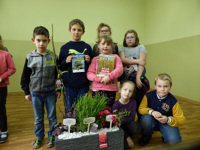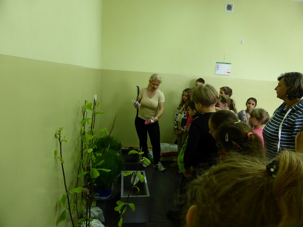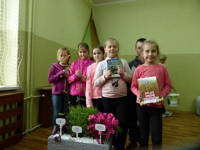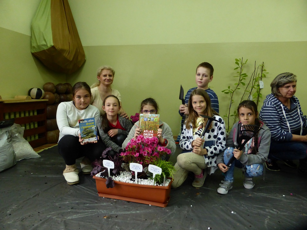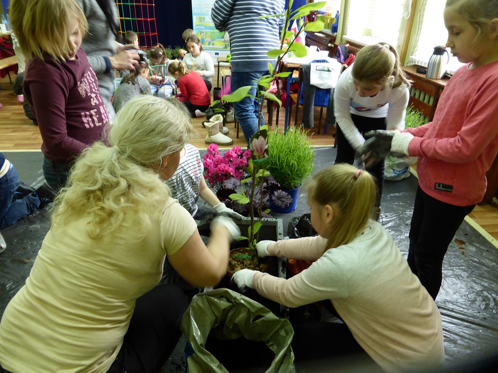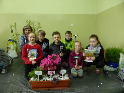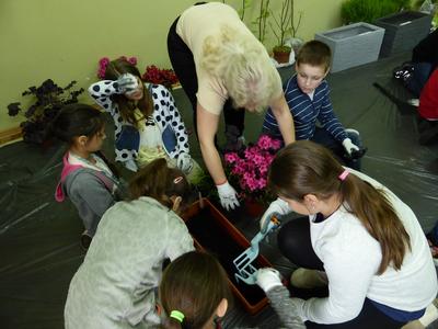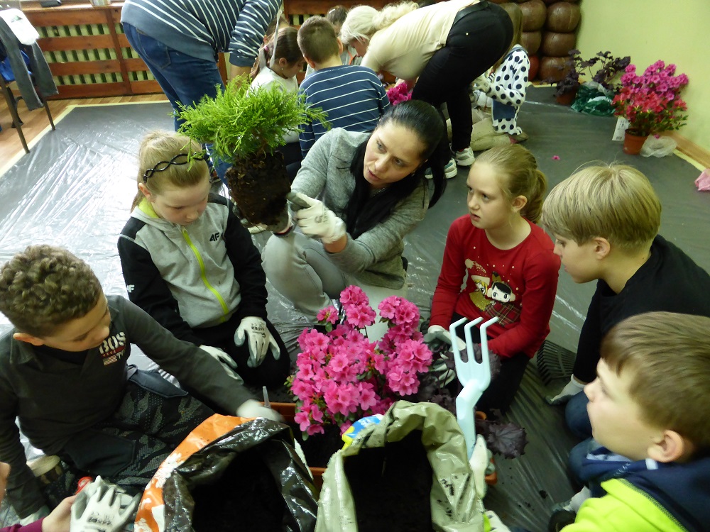 Po wizycie w arboretum uczniowie pojechali do szkoły w Rzuchowie, aby po krótkim odpoczynku przystąpić do prac ogrodniczych. Dzieci zostały podzielone na cztery mieszane grupy. Zadaniem każdej z nich było wykonanie kompozycji kwiatowych w donicach. Pod czujnym okiem pani Izabeli Janczar uczniowie świetnie poradzili sobie z prawidłowym przygotowaniem podłoża, odpowiednim doborem kompozycji roślinnej, a także wyszukaniem w atlasach nazw łacińskich nasadzonych roślin.