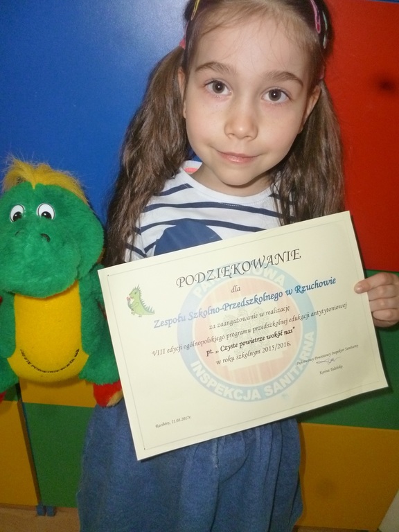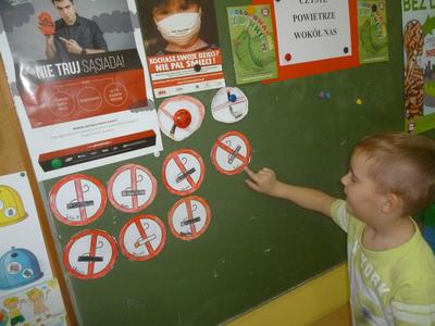 Nasze przedszkole zrealizowało program przedszkolnej edukacji antytytoniowej „Czyste powietrze wokół nas”. Założeniem programu jest ochrona dzieci przed szkodliwym wpływem dymu tytoniowego. Program ma charakter profilaktyczny, ale przede wszystkim ma na celu wykształcenie u dzieci świadomej postawy ochrony własnego zdrowia w sytuacjach, gdy są skazane na bezpośredni kontakt z palącymi.