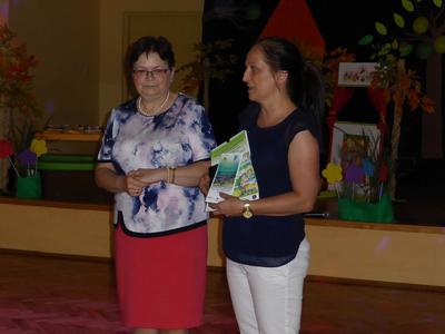 Następnie na ręce gości (pani skarbnik, pana starosty i dyrektora) zostały złożone przez Panią Dyrektor Wandę Knurę pamiątkowe albumy - fotorelacje z działań projektowych. Przy tej okazji padały zapewnienia o dalszej współpracy.