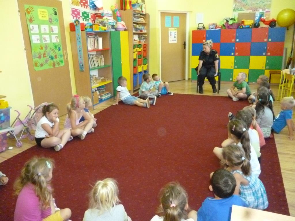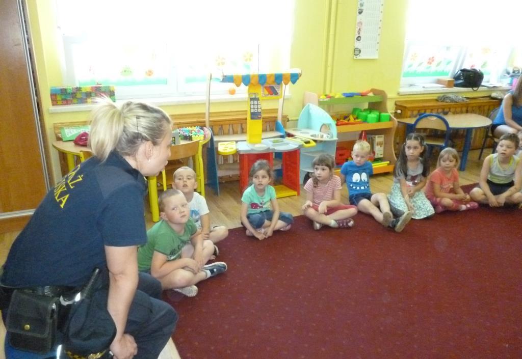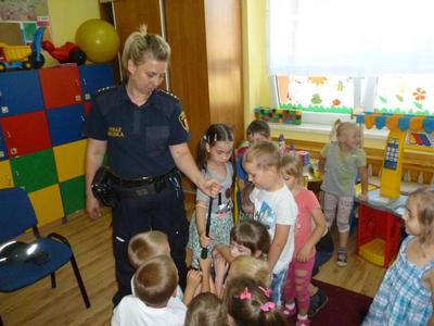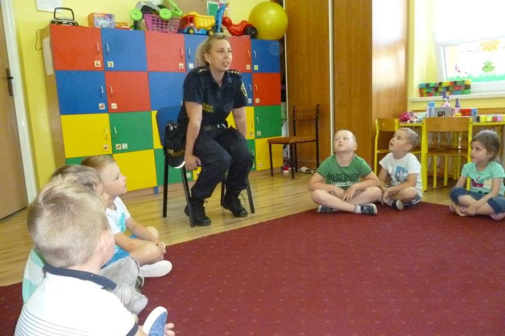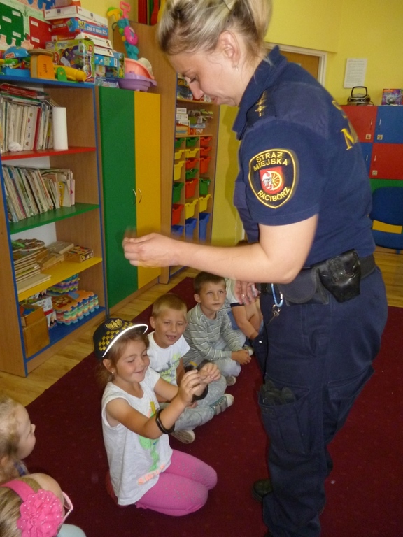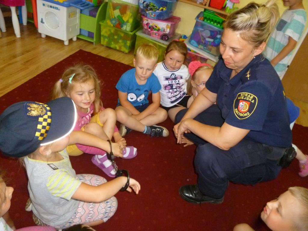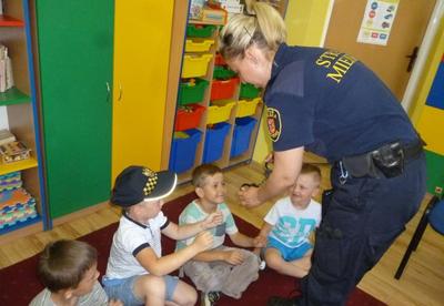 21 czerwca przedszkole w Rzuchowie odwiedziła funkcjonariuszka Straży Miejskiej, która przeprowadziła pogadankę na temat „Bezpiecznych wakacji”. Przedszkolaki z wielkim zainteresowaniem słuchały, jak należy zachować się nad morzem, w górach, na placu zabaw i na basenie. Nasz gość przypomniał dzieciom także zasady dotyczące kontaktów z osobami nieznajomymi. Ponadto Strażniczka Miejska opowiedziała nam trochę o swojej pracy. Dzieci dowiedziały się m.in. do czego służy gaz pieprzowy, pałka oraz kajdanki. Spotkanie odbyło się w miłej atmosferze z aktywnym udziałem dzieci, które chętnie pochwaliły się znajomością podstawowych znaków drogowych oraz numerów alarmowych. Na koniec zaśpiewaliśmy piosenkę „Halo, panie policjancie” oraz serdecznie podziękowaliśmy naszemu gościowi za przybycie i za przekazanie nam cennych wakacyjnych rad.