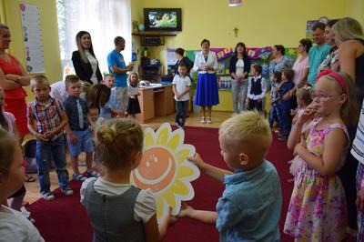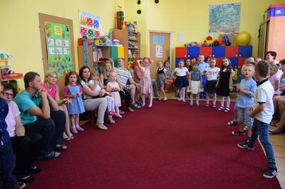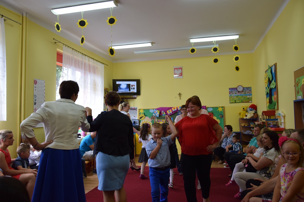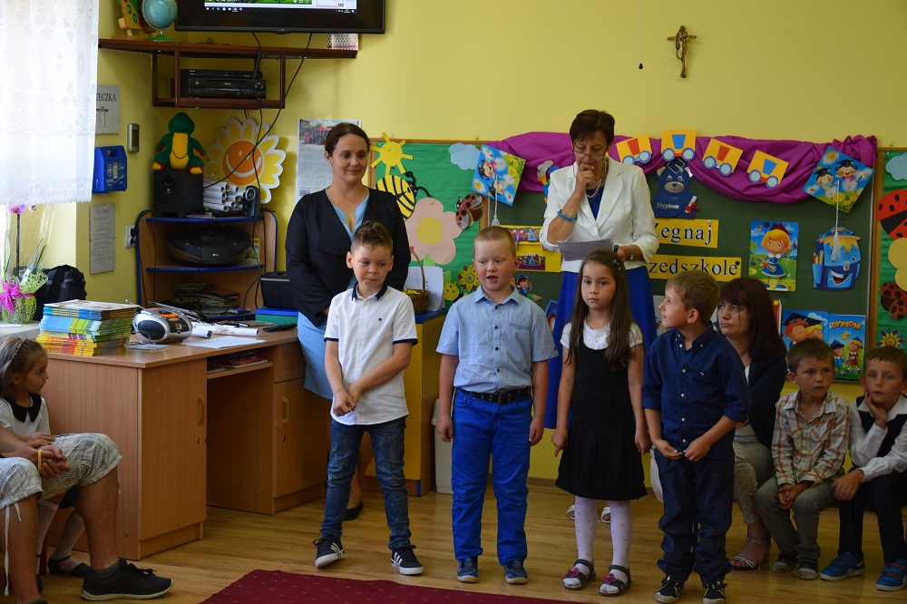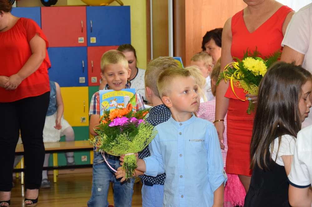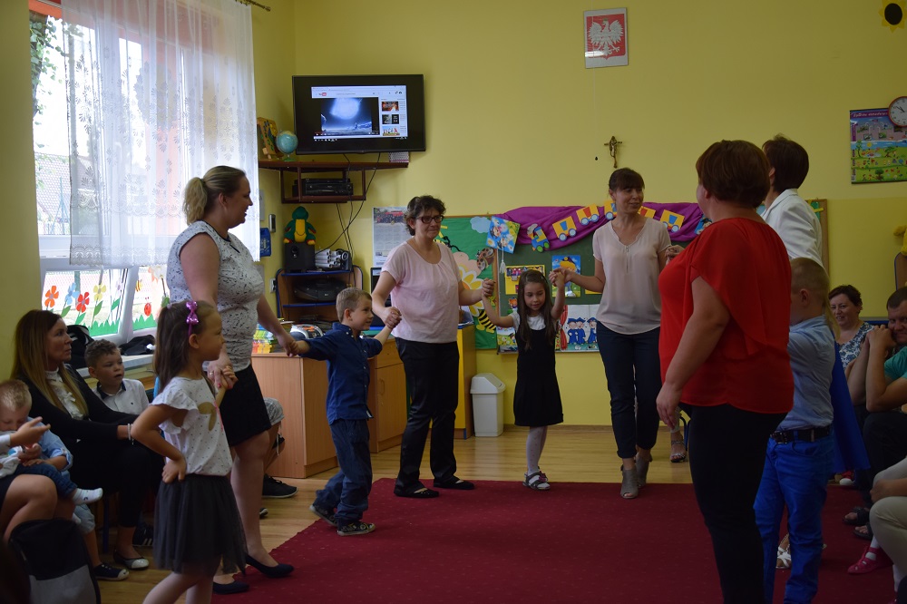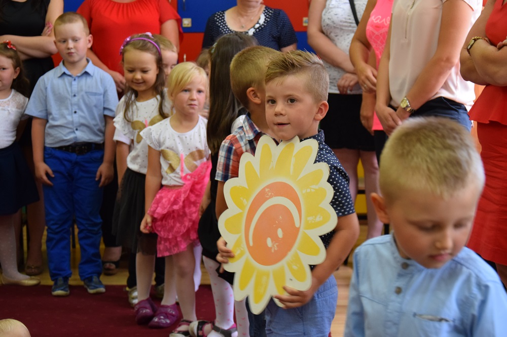 23 czerwca 2017 roku w naszym przedszkolu odbyło się uroczyste zakończenie roku szkolnego. Przedszkolaki recytowały wierszyki oraz śpiewały piosenki. Młodsze dzieci pożegnały swoich kolegów i koleżanki odchodzące z nowym rokiem szkolnym do szkoły. Przy tej okazji mamy starszaków w ramach akcji „Cała Polska Czyta Dzieciom” przeczytały wiersze z książeczki „Dobre wychowanie wierszem” („Przyjaciela warto mieć”, „Jak na jezdni się zachować”, „O tym, że mamy słuchać należy”, „Na co w domu uważać trzeba”). Następnie podczas zabawy ze słonkiem wybrane dzieci wypowiadały się na temat tego, co podobało im się w mijającym roku w przedszkolu. Później sześciolatki wraz z rodzicami zatańczyły poloneza, a po nim uczestniczyły w quizie podsumowującym programy i konkursy: „Czyste powietrze wokół nas”, konkurs „Nie truj sąsiada” oraz zasady bezpieczeństwa i dobrego zachowania. Na koniec wszyscy obecni na uroczystości zaśpiewali pożegnalną pieśń „Ogniska już dogasa blask” oraz przekazali sobie „iskierkę przyjaźni”, a przedszkolaki otrzymały pamiątkowe dyplomy, książki oraz tabla. Wszystkim rodzicom dziękujemy za pomoc i współpracę, a dzieciom życzymy bezpiecznych, słonecznych wakacji oraz udanego wypoczynku.