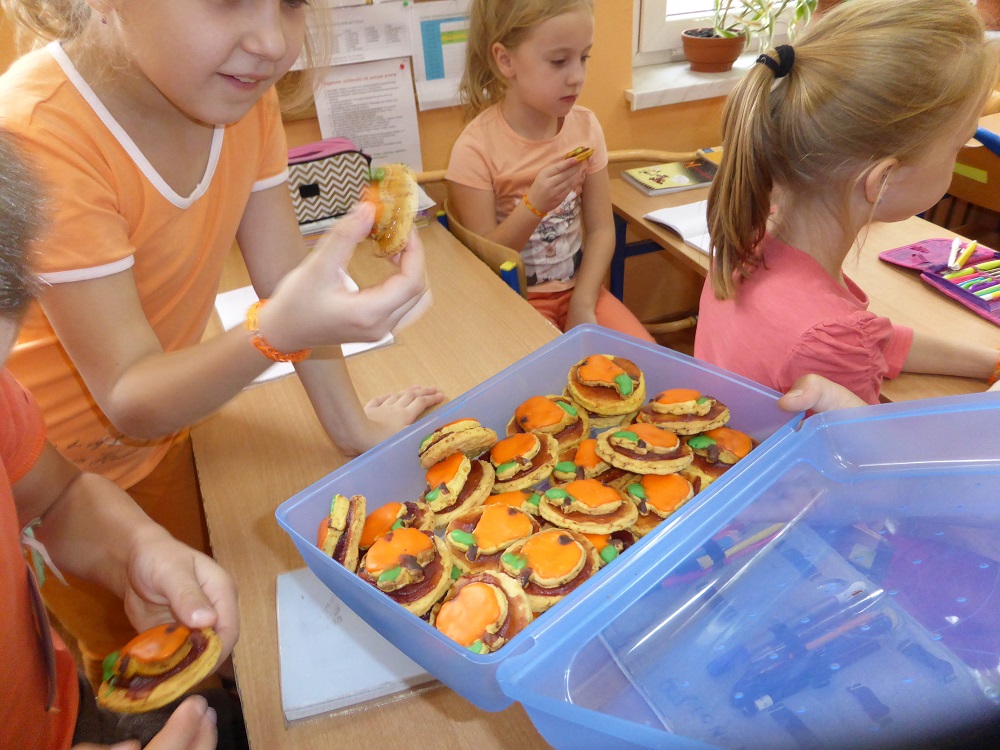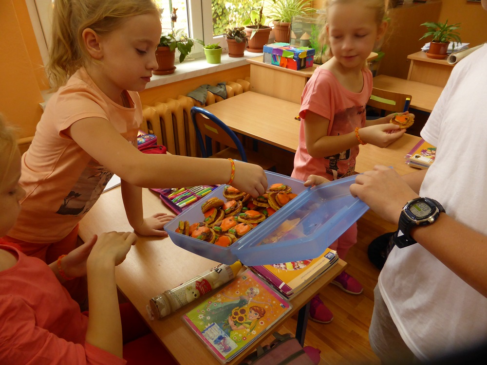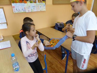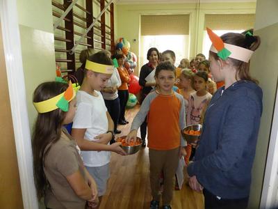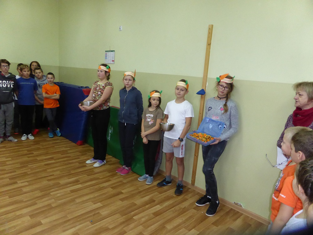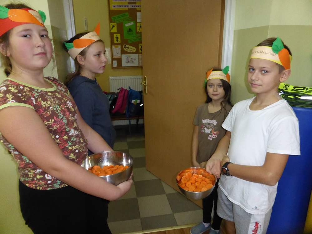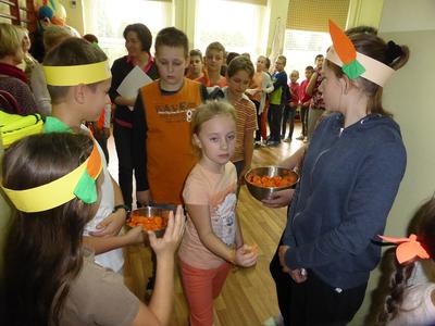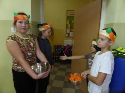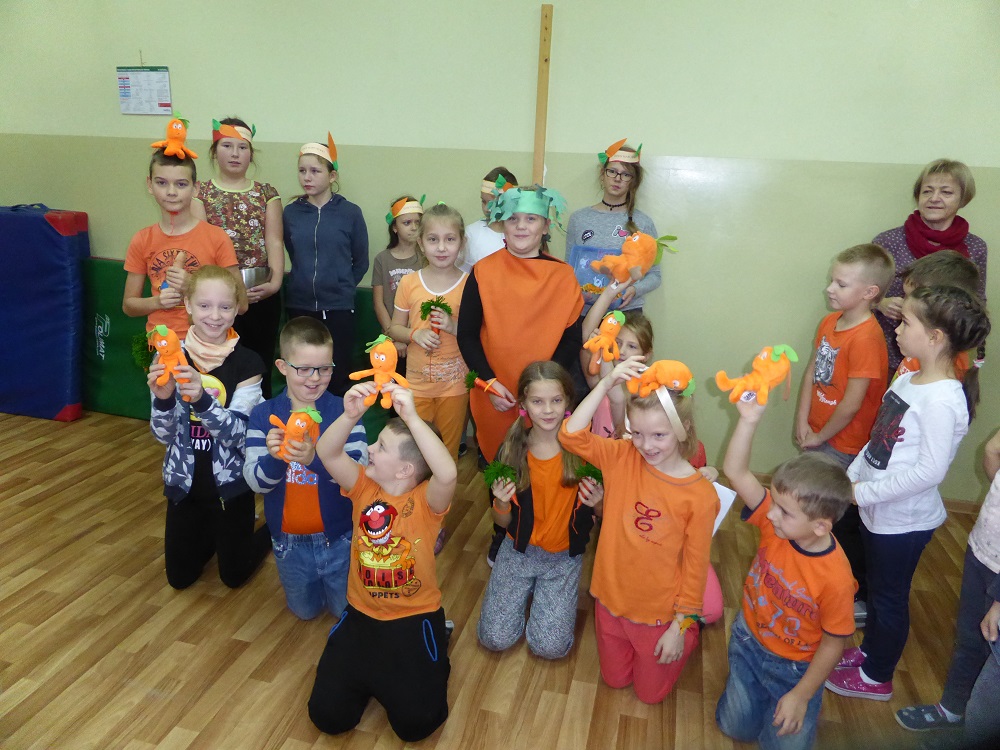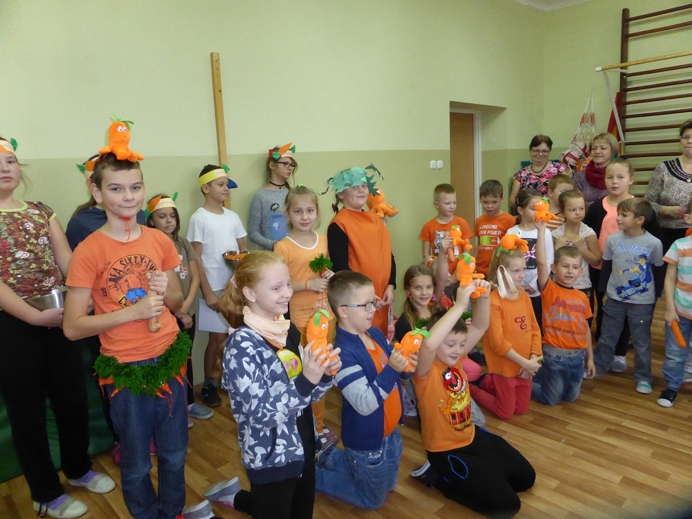 3 listopada obchodziliśmy w naszej szkole ,,Dzień marchewki". Cała akcja rozpoczęła się od apelu, na którym uczniowie poszczególnych klas wspaniale prezentowali się w marchewkowych przebraniach, a i kolor pomarańczowy w uczniowskiej garderobie w tym dniu szczególnie dominował. Przewodniczący otrzymali zadania - karty pracy i w klasowych zespołach uczniowie zapoznawali się z walorami odżywczymi, zdrowotnymi oraz smakowymi tego warzywa. Były też marchewkowe prace plastyczno - techniczne, które podniosły estetyczny wizerunek ściennych gazetek informujących o pochodzeniu marchewki, dostępnych odmianach, ciekawostkach i możliwościach wykorzystania jej w wielu dziedzinach życia. Świętowaniu towarzyszyła degustacja kolorowych marchewkowych ciasteczek oraz chrupanie marchewek podczas przerw międzylekcyjnych. Akcja zakończyła się wizytą w przedszkolu, gdzie zachęcaliśmy do spożywania marchewki pod różnymi postaciami oraz zwróciliśmy uwagę na jej wartości odżywcze i smakowe. Każdy przedszkolak otrzymał na pamiątkę uśmiechniętą papierową marchewkę - zakładkę do książki. Obserwując zachowania uczniów, był to dzień pełen wrażeń oraz marchewkowych niespodzianek, a tym samym wzbogacał wiedzę i zachęcał do dbania o własne zdrowie i właściwe odżywianie.