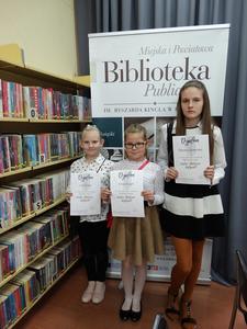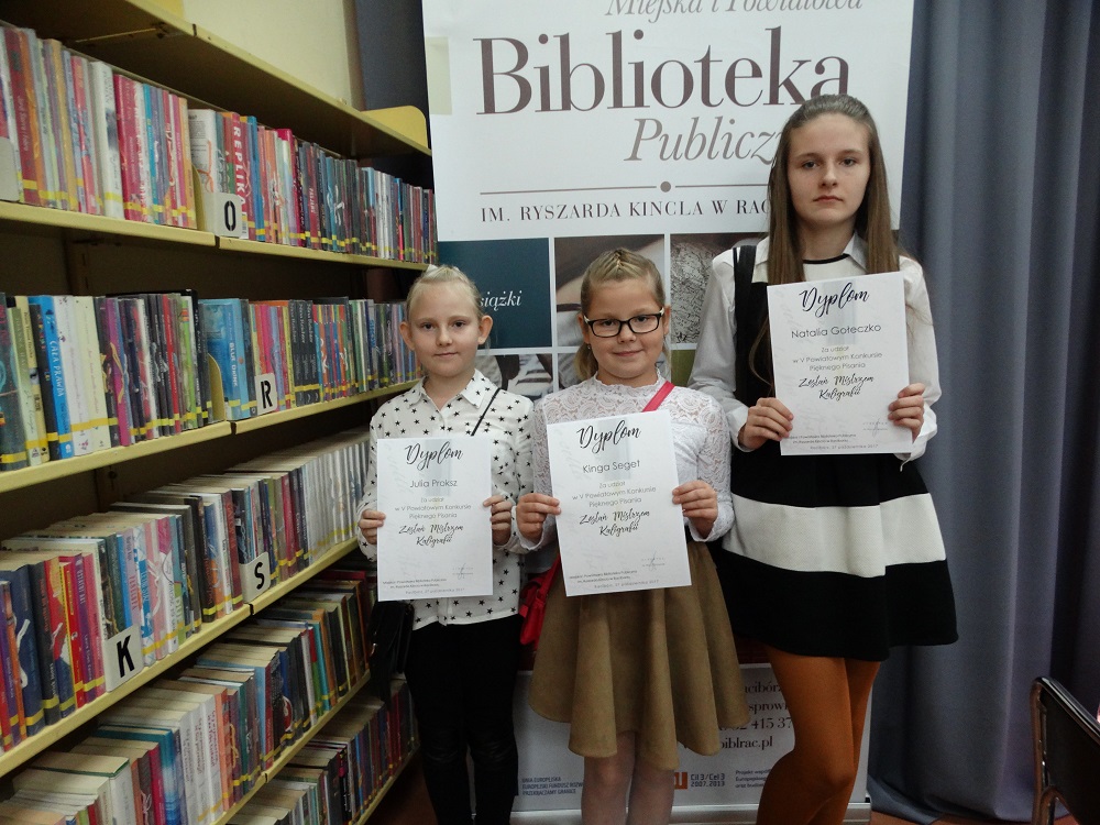 27 października 2017r. reprezentantki naszej szkoły brały udział w Powiatowym Konkursie Pięknego Pisania „Zostań Mistrzem Kaligrafii”, który odbył się w Miejskiej i Powiatowej Bibliotece Publicznej im. R. Kincla w Raciborzu. Celem konkursu jest propagowanie wśród uczniów sztuki pięknego pisania, zachęcanie do dbania o estetykę i charakter pisma oraz rozwijanie w uczniach zasad poprawnego stylu pisania. Uczennice – Kinga i Julia z klasy IV oraz Natalia z klasy VI - zostały wytypowane do konkursu w drodze eliminacji szkolnych, które przeprowadzono w szkolnej bibliotece. Dziewczynki rywalizowały z uczniami kilku szkół powiatu raciborskiego. Mimo że w tym roku żadnej z naszych uczennic nie udało się stanąć na podium, składamy im serdeczne gratulacje i życzymy sukcesów w kolejnych konkursach.
