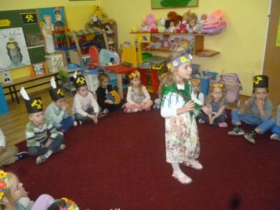 4 grudnia w naszym przedszkolu odbyła się uroczystość z okazji Dnia Górnika. Przedszkolaki recytowały wiersze, śpiewały piosenki, np. "Idzie górnik drogą", "Karliku, Karliku" czy "Wele drogi oset". Wspólnie z górnikami udało się nam zaśpiewać piosenki: "Szła dzieweczka" oraz "Górnicze skarby pod ziemią". Następnie dzieci zatańczyły śląskie tańce: "Nie chcę cię" i "Grozik". Na koniec złożyły górnikom życzenia. W ten sposób chcieliśmy podziękować górnikom za ich ciężką i ważną dla społeczeństwa pracę.