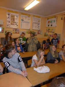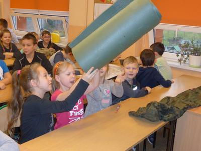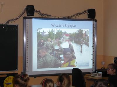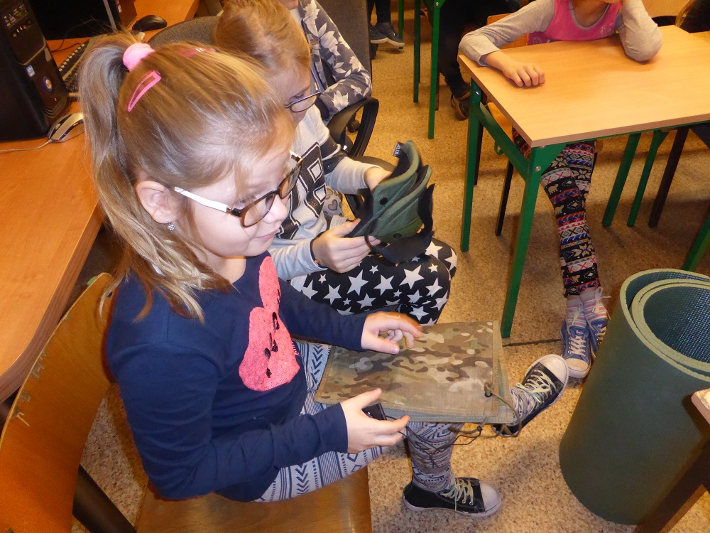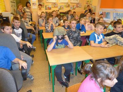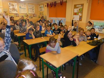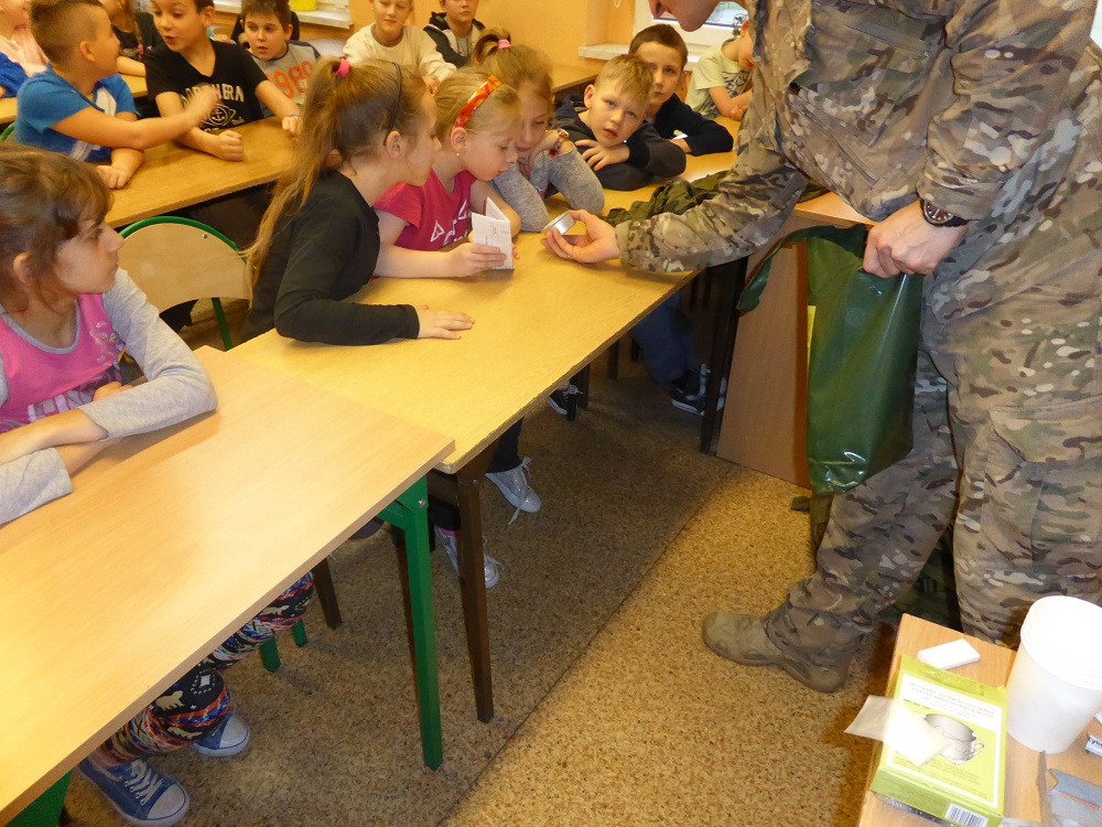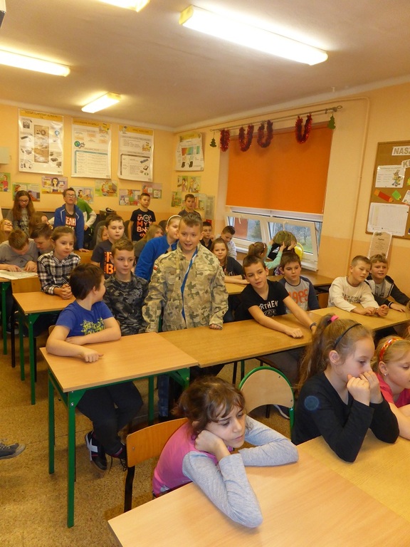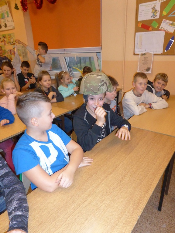 Jakie zadania wykonują żołnierze podczas swojej służby, jak są ubrani i co noszą w plecaku? O tym wszystkim dowiedzieli się uczniowie klasy II, IV i VI podczas spotkania z żołnierzem weteranem, który przybył do naszej szkoły z całym ekwipunkiem i w pełnym umundurowaniu. Podczas prelekcji gość bardzo ciekawie mówił o służbie i roli, jaką pełni żołnierz zarówno w czasie konfliktów zbrojnych, jak i w czasie pokoju, a wszystko poparte zostało prezentacją multimedialną. Dzieci miały możliwość bardzo dokładnie poznać wyposażenie żołnierskiego plecaka, zobaczyć, dotknąć oraz przymierzyć poszczególne części garderoby - hełm, maski, kamizelki, kurtki, czy też okulary. Niemałe zainteresowanie dało się zauważyć podczas dokładnego omawiania przez gościa zestawu indywidualnej racji żywieniowej oraz jej degustacji przez uczniów. W czasie prelekcji dzieci otrzymały w sposób przejrzysty i trafny wiele cennych i ciekawych informacji o zestawie przedmiotów wojskowych, które służą do wykonywania określonych zadań. Zainteresowanie ze strony słuchających było bardzo duże - dzieci chętnie uczestniczyły w dyskusji, odpowiadały na pytania gościa i zadawały swoje własne. Na koniec wszyscy zebrani mogli zobaczyć trzy ciekawe filmy instruktażowe podsumowujące zdobytą wiedzę. Pani Dyrektor serdecznie podziękowała za ciekawą lekcję patriotyzmu, a delegacja uczennic podziękowała za wrażenia i interesujące spotkanie.