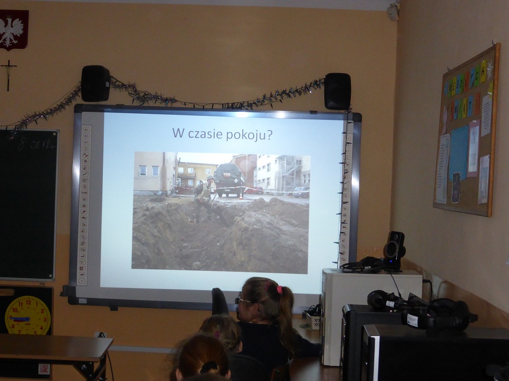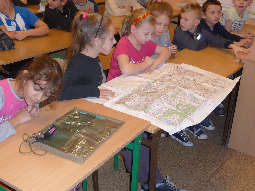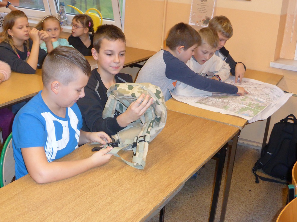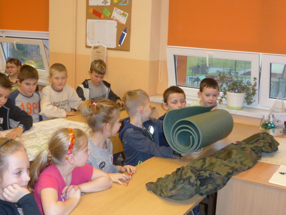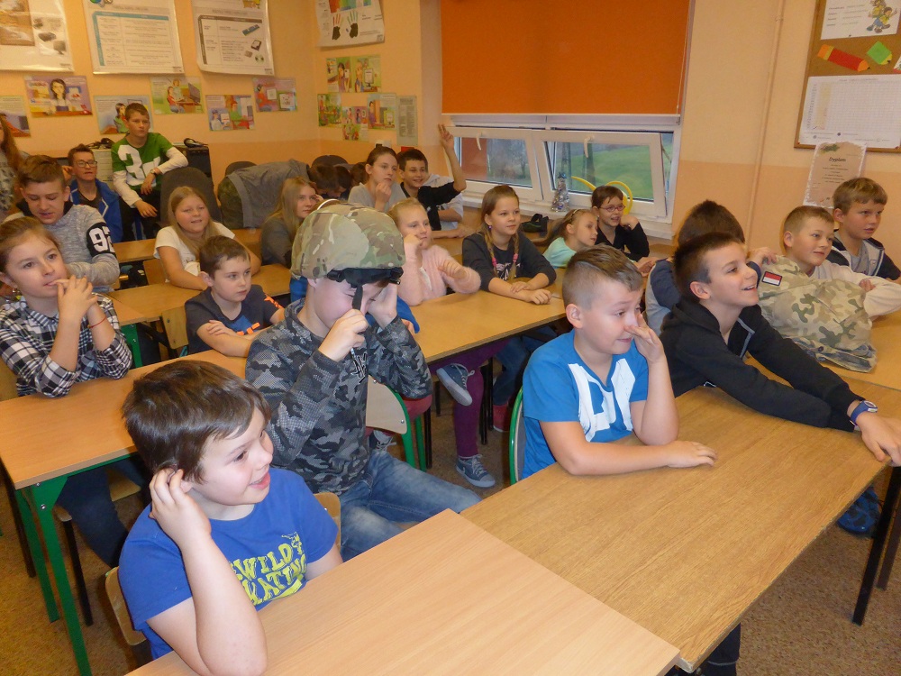 Jakie zadania wykonują żołnierze podczas swojej służby, jak są ubrani i co noszą w plecaku? O tym wszystkim dowiedzieli się uczniowie klasy II, IV i VI podczas spotkania z żołnierzem weteranem, który przybył do naszej szkoły z całym ekwipunkiem i w pełnym umundurowaniu. Podczas prelekcji gość bardzo ciekawie mówił o służbie i roli, jaką pełni żołnierz zarówno w czasie konfliktów zbrojnych, jak i w czasie pokoju, a wszystko poparte zostało prezentacją multimedialną. Dzieci miały możliwość bardzo dokładnie poznać wyposażenie żołnierskiego plecaka, zobaczyć, dotknąć oraz przymierzyć poszczególne części garderoby - hełm, maski, kamizelki, kurtki, czy też okulary. Niemałe zainteresowanie dało się zauważyć podczas dokładnego omawiania przez gościa zestawu indywidualnej racji żywieniowej oraz jej degustacji przez uczniów. W czasie prelekcji dzieci otrzymały w sposób przejrzysty i trafny wiele cennych i ciekawych informacji o zestawie przedmiotów wojskowych, które służą do wykonywania określonych zadań. Zainteresowanie ze strony słuchających było bardzo duże - dzieci chętnie uczestniczyły w dyskusji, odpowiadały na pytania gościa i zadawały swoje własne. Na koniec wszyscy zebrani mogli zobaczyć trzy ciekawe filmy instruktażowe podsumowujące zdobytą wiedzę. Pani Dyrektor serdecznie podziękowała za ciekawą lekcję patriotyzmu, a delegacja uczennic podziękowała za wrażenia i interesujące spotkanie.