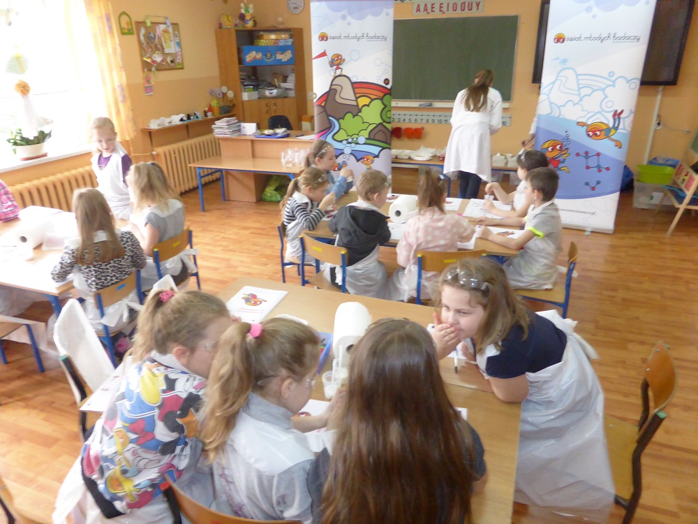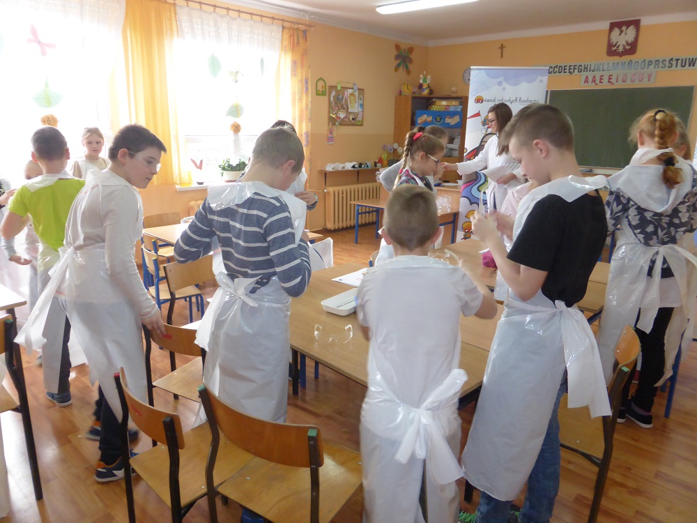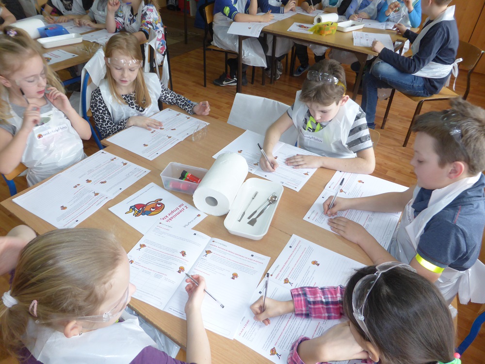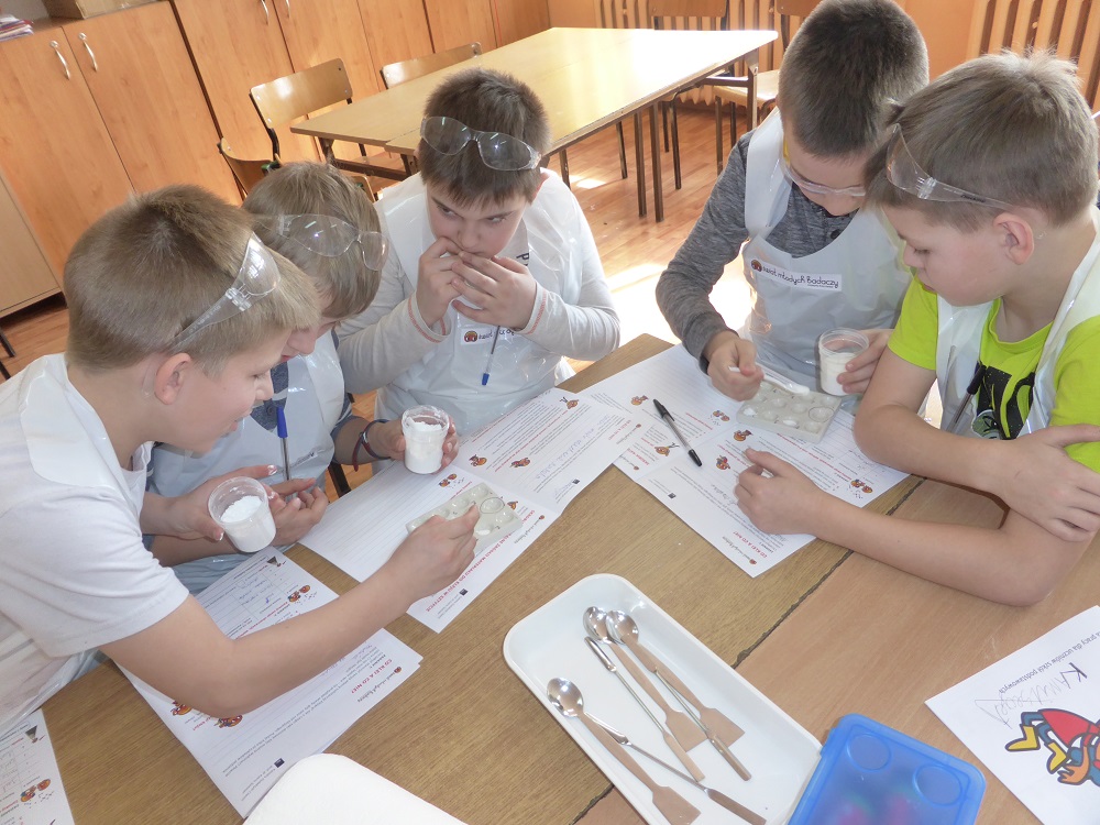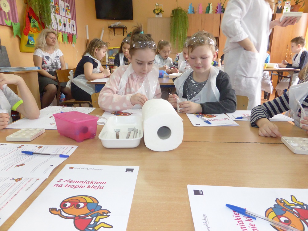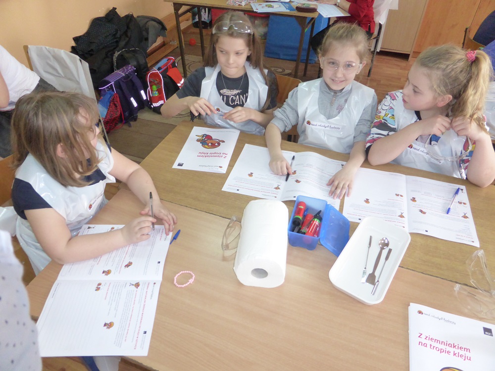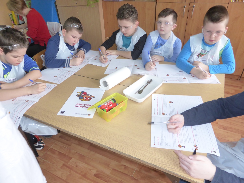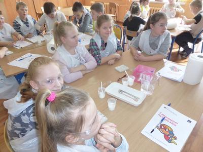 W naszej szkole 13.03.2018 roku odbyły się zajęcia badawcze z udziałem uczniów klas: drugiej, trzeciej i czwartej. Zajęcia odbywały się w formie dziewięćdziesięciominutowych, interaktywnych i atrakcyjnych warsztatów, prowadzonych przez przeszkolonych edukatorów organizacji: Nauka Jest Fajna! - partnera edukacyjnego programu. Uczniowie naszej szkoły wykonywali nieskomplikowane eksperymenty badawcze – "Z ziemniakiem na tropie kleju"; musieli m.in. podołać samodzielnemu odmierzaniu i mieszaniu potrzebnych składników. Mieli też czas na omawianie wyników przeprowadzonych eksperymentów, zadawali liczne pytania prowadzącym, snuli hipotezy i wyciągali wnioski - innymi słowy mogli poczuć się jak prawdziwi badacze w laboratorium.