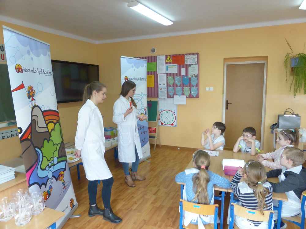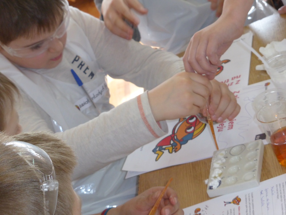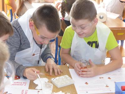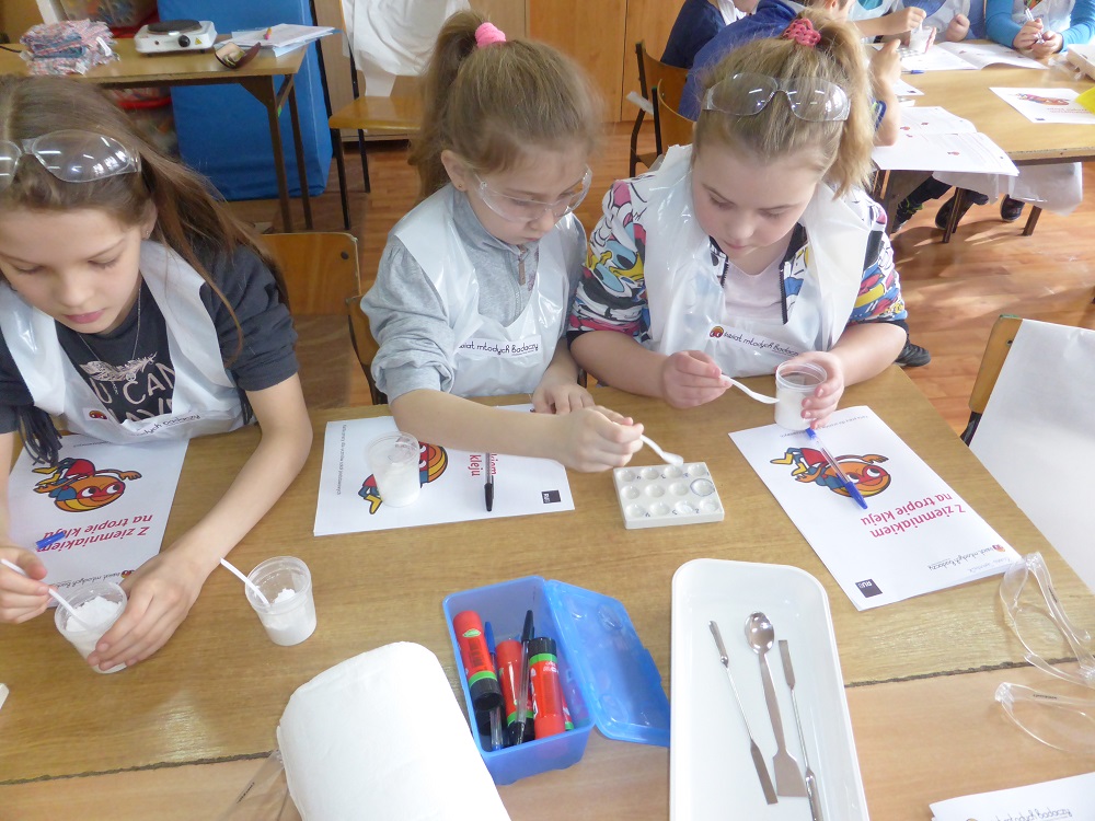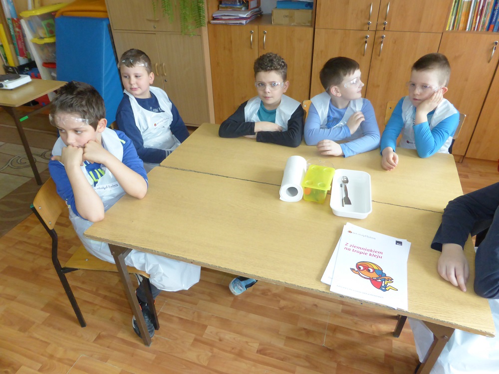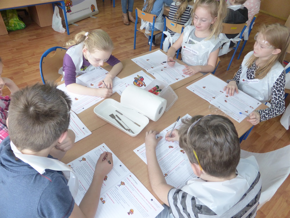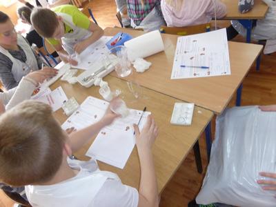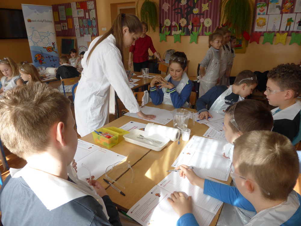W naszej szkole 13.03.2018 roku odbyły się zajęcia badawcze z udziałem uczniów klas: drugiej, trzeciej i czwartej. Zajęcia odbywały się w formie dziewięćdziesięciominutowych, interaktywnych i atrakcyjnych warsztatów, prowadzonych przez przeszkolonych edukatorów organizacji: Nauka Jest Fajna! - partnera edukacyjnego programu. Uczniowie naszej szkoły wykonywali nieskomplikowane eksperymenty badawcze – "Z ziemniakiem na tropie kleju"; musieli m.in. podołać samodzielnemu odmierzaniu i mieszaniu potrzebnych składników. Mieli też czas na omawianie wyników przeprowadzonych eksperymentów, zadawali liczne pytania prowadzącym, snuli hipotezy i wyciągali wnioski - innymi słowy mogli poczuć się jak prawdziwi badacze w laboratorium.
