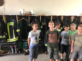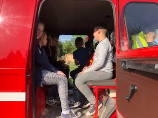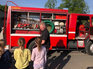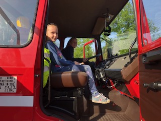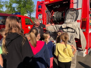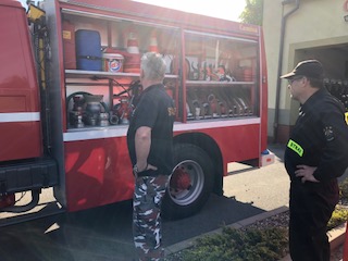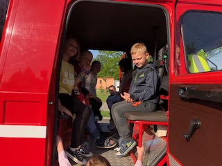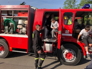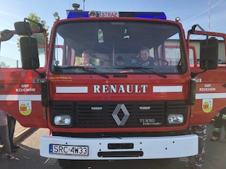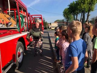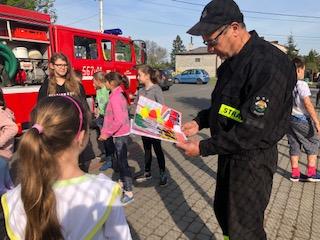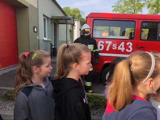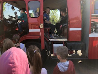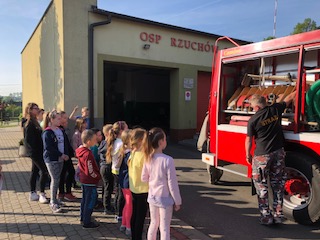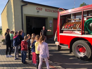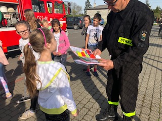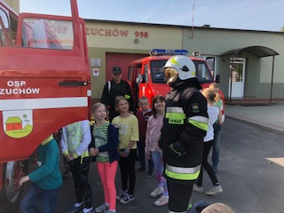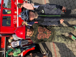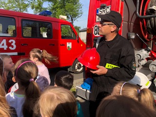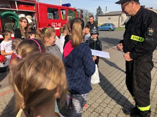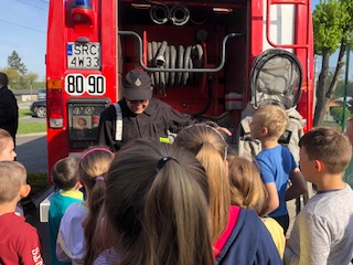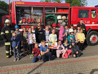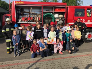 Delegacja dzieci wraz z opiekunami udała się do siedziby OSP w naszej miejscowości. Przed budynkiem remizy w pełnym umundurowaniu i z wozem strażackim czekali na nas gospodarze, którzy serdecznie przywitali dzieci. Uczniowie dowiedzieli się, jak długo istnieje jednostka, jak kiedyś wyglądała służba. Następnie strażacy zaprezentowali dzieciom ubrania, sprzęt gaśniczy, nakreślili młodym słuchaczom specyfikę służby, zagrożenia i niebezpieczeństwa, jakie czyhają na strażaków w czasie zadań. Uczniowie przymierzali hełmy i z wielką radością zasiadali za kierownicą wozu, by na chwilę poczuć się i wcielić w rolę strażaka. W czasie pogadanki przypomniano, że strażacy nie tylko gaszą pożary, ale także ratują ludzi w czasie wypadków drogowych, pomagają w klęskach i katastrofach, akcjach humanitarnych. Podczas spotkania dzieci wykazały duże zainteresowanie pracą strażaków, brały udział w dyskusji, zdobyły i utrwaliły cenną wiedzę o zachowaniu bezpieczeństwa swojego i innych w różnych sytuacjach - w domu, na ulicy, w szkole, na placu zabaw. Na zakończenie delegacja uczniów wręczyła strażakom samodzielnie wykonane drobne upominki oraz złożyła podziękowania za służbę i życzenia z okazji zbliżającego się Święta Strażaka. Zaś strażacy na pożegnanie poczęstowali dzieci słodkimi niespodziankami. Dziękujemy za ciekawą prelekcję, życzymy wszystkim strażakom zdrowia, odwagi i satysfakcji z pełnionej służby.
