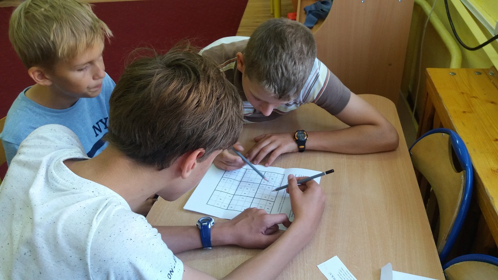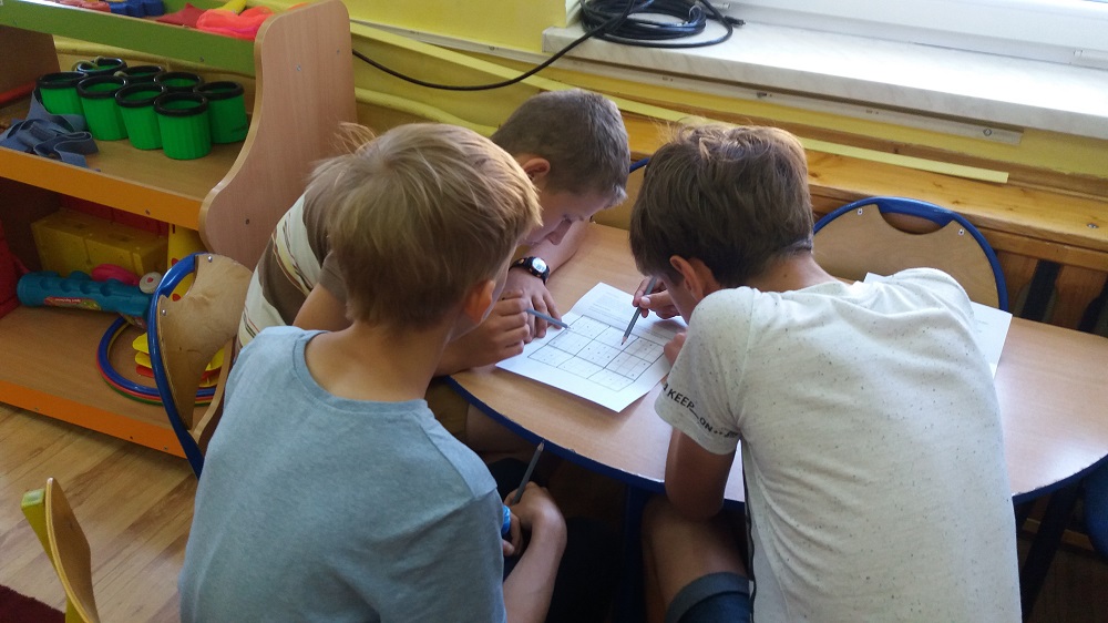 Tegoroczny DWM przybrał ponownie formę podchodów. Najpierw losowo stworzyliśmy trzyosobowe, mieszane drużyny, a następnie każda z nich wyruszyła w trasę, wskazywaną zagadkami. Do zaliczenia było 5 zadań: dyktando matematyczne, sudoku, "zakupy" w miejscowym sklepie, gra: kręgle finskie, pomiar i obliczenie pola powierzchni szkolnego boiska.