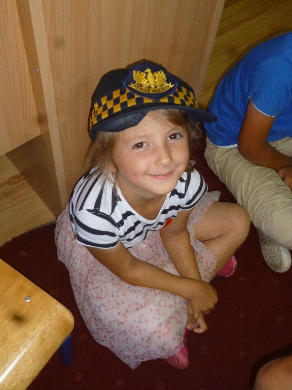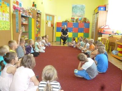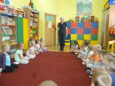 Pod koniec roku szkolnego zaprosiliśmy do przedszkola Straż Miejską. Celem wizyty było uczulenie dzieci na przestrzeganie zasad bezpieczeństwa podczas wakacji. Dzieci dowiedziały się, że poza swoi,m podwórkiem powinny poruszać się tylko pod opieką rodziców. Na kąpieliskach, a nawet w basenach przy domu, również dzieci powinny znajdować się pod opieką dorosłych. Jeżdżąc na rowerze powinny chronić głowę za pomocą kasku. Dzieci nie powinny rozmawiać z obcymi, otwierać im drzwi czy brać od nich słodyczy. Przedszkolaki uczyły się także jak postępować podczas kontaktu z z obcym psem. Później przedszkolaki obejrzały jeszcze film edukacyjny "Bezpieczne zachowania", aby utrwalić swoje wiadomości dotyczące tak ważnej kwestii, jaką jest ochrona życia.