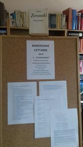 W roku setnej rocznicy odzyskania przez Polskę niepodległości zaproponowano wspólne czytanie „Przedwiośnia” Stefana Żeromskiego, ale też wyznaczono 44 wielkie dzieła zawarte w Antologii Niepodległości. I właśnie kilka spośród tekstów Antologii odczytali szóstoklasiści z bibliotekarką. Był wśród nich wiersz Alojzego Felińskiego „Boże, coś Polskę”, utwór Cypriana Kamila Norwida „Moja piosnka (II)”, a także fragment XII księgi „Pana Tadeusza” – „Koncert Jankiela”.
