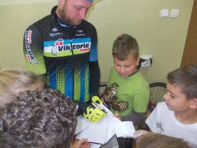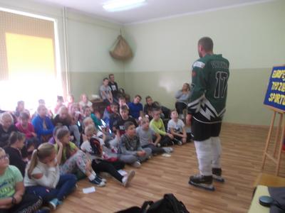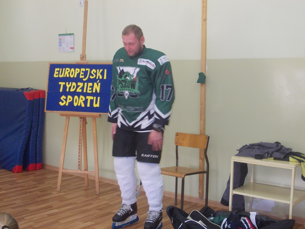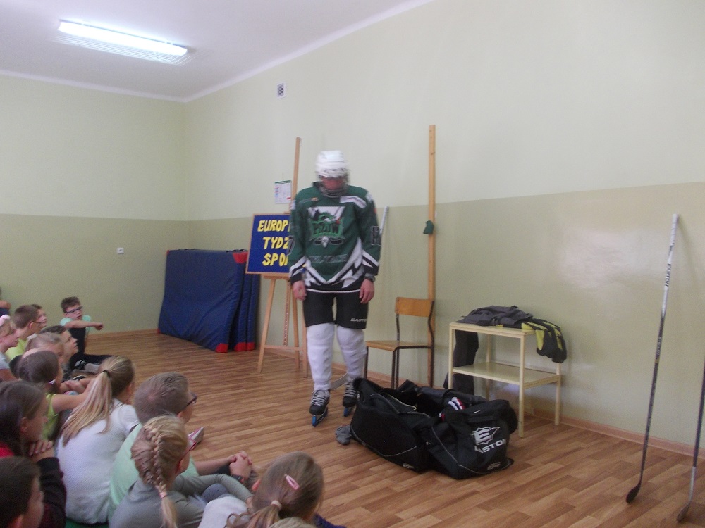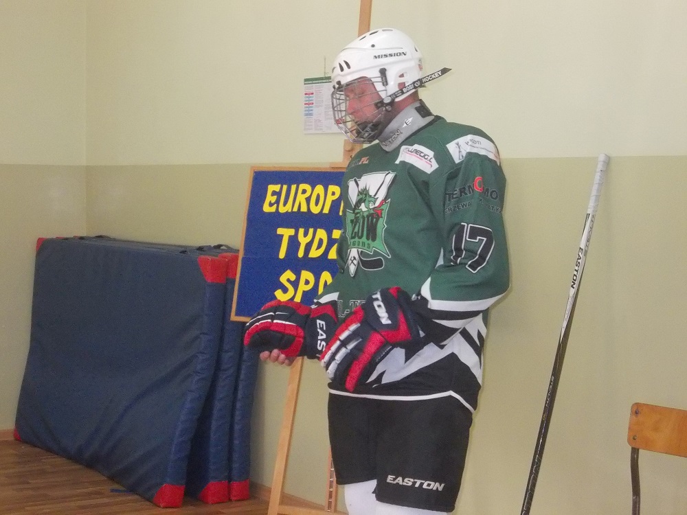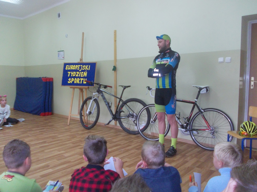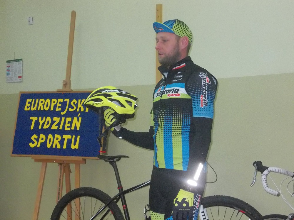W kolejnych dniach, to jest 27 i 28 września, swoimi pasjami sportowymi, a mianowicie kolarstwem i hokejem na lodzie zachwycił dzieci pan Marcin Drzeniek - pracownik naszej szkoły. Opowiadał on o rodzajach rowerów do jazdy treningowej, stroju kolarskim, sposobach porozumiewania się kolarzy między sobą podczas jazdy - sygnałach i znakach w formie gestów pomocnych w bezpiecznej jeździe. Przedstawił ciekawostki o zawodach kolarskich, przygotowaniach do nich, poruszył temat odżywianiazawodnika. Ogromnym zainteresowaniem cieszył się strój hokeisty i sposób jego zakładania.Pan Marcin reprezentuje Klub Kolarski Viktoria w Rybniku oraz HokejowyDragons w Pszowie. Naszemu gościowi również bardzo dziękujemy i życzymy wielu sukcesów w nadchodzącym sezonie na tafli lodowej.