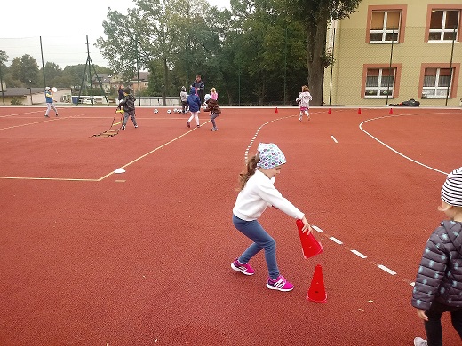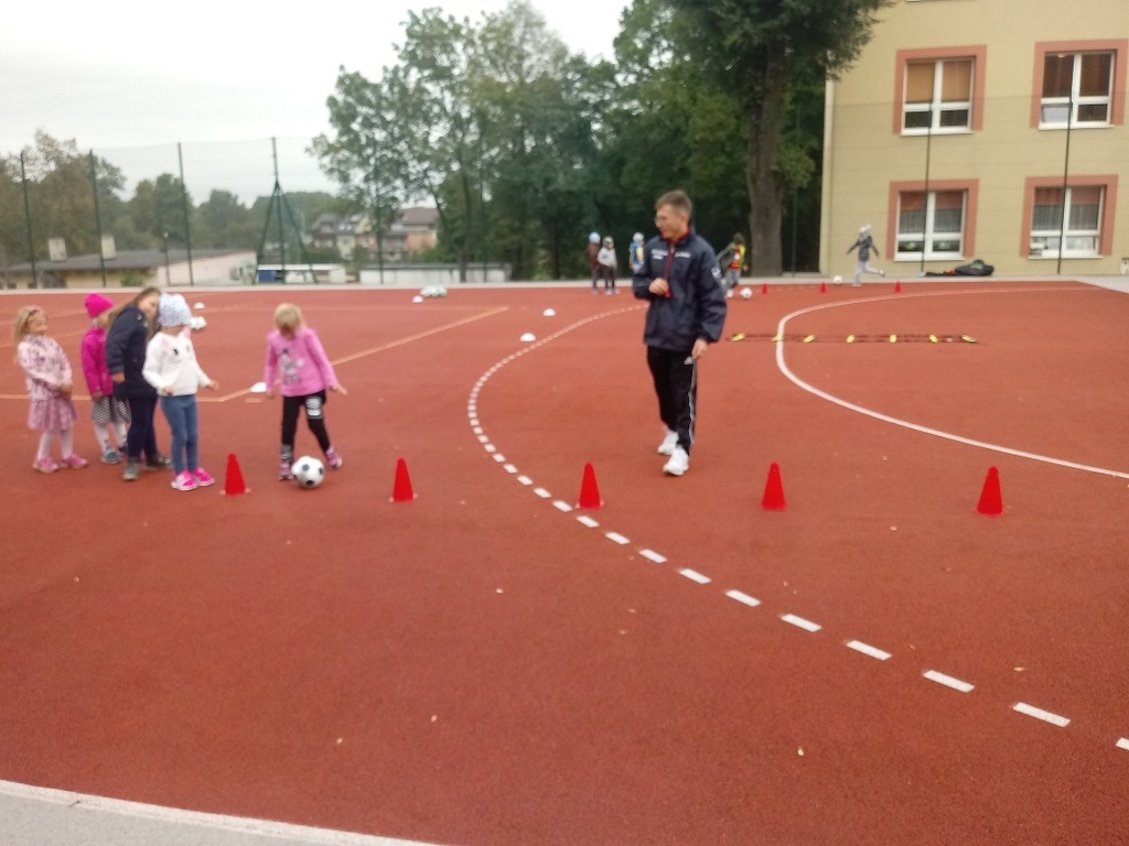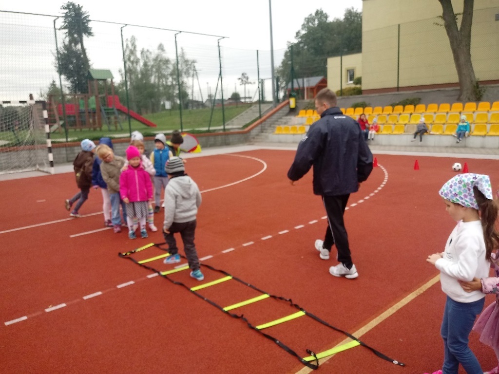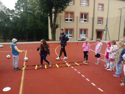 27 września w ramach Europejskiego Tygodnia Sportu nasze przedszkole odwiedził pan Paweł Styrnol, trener z Akademii Piłkarskiej UNITED. Przeprowadził on z dziećmi trening na boisku szkolnym. Na początku zajęć ustalił z przedszkolakami zasady zachowania podczas treningu, kolejnym punktem spotkania była rozgrzewka, czyli zabawa w berka, podawanie sobie piłki nogą, bieganie slalomem między pachołkami i próba wrzucenia piłki do bramki. Najważniejszym punktem spotkania było zadanie polegające na biegu slalomem i próbie zagrania piłki nogą w stronę bramki. Dzieciom bardzo podobał się trening, na zakończenie zadbały o porządek na boisku, podziękowały panu trenerowi za zajęcia i wręczyły laurkę.