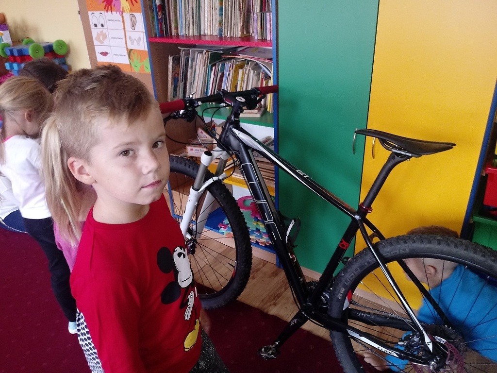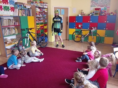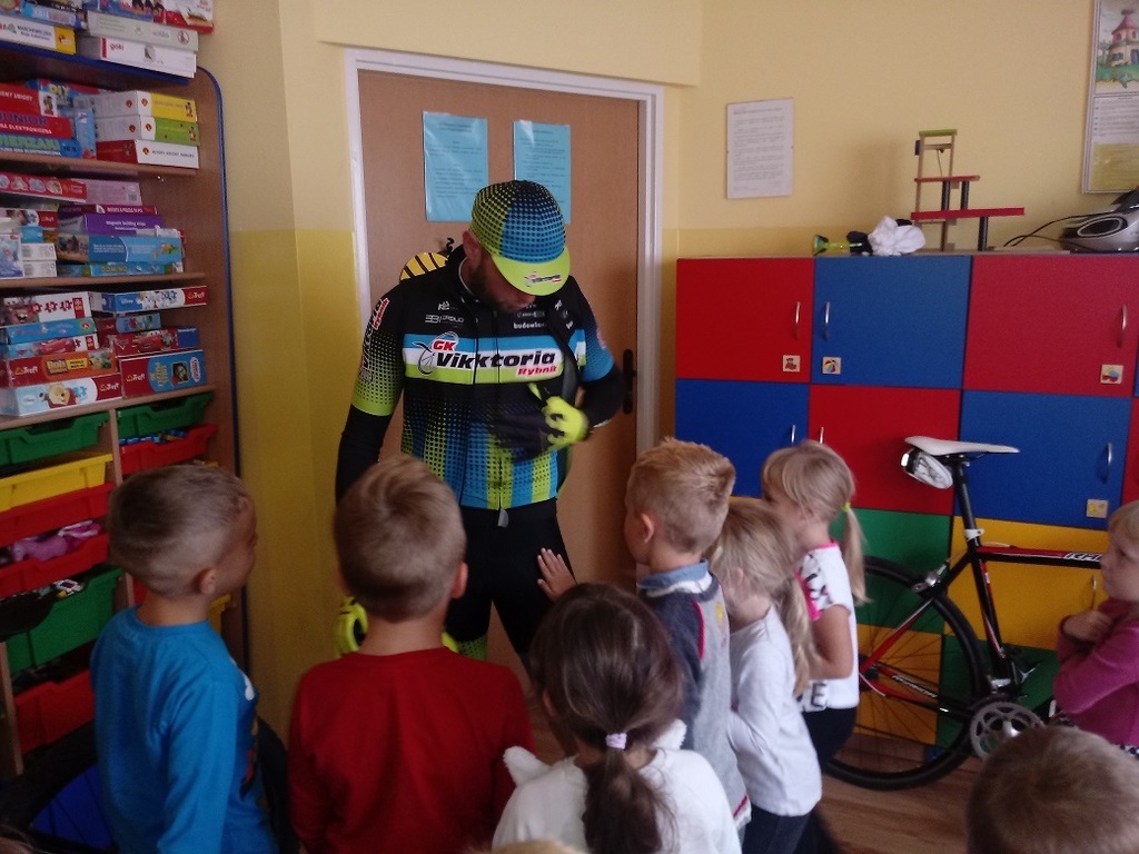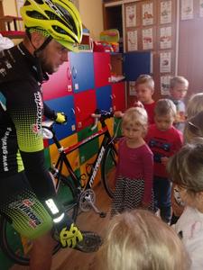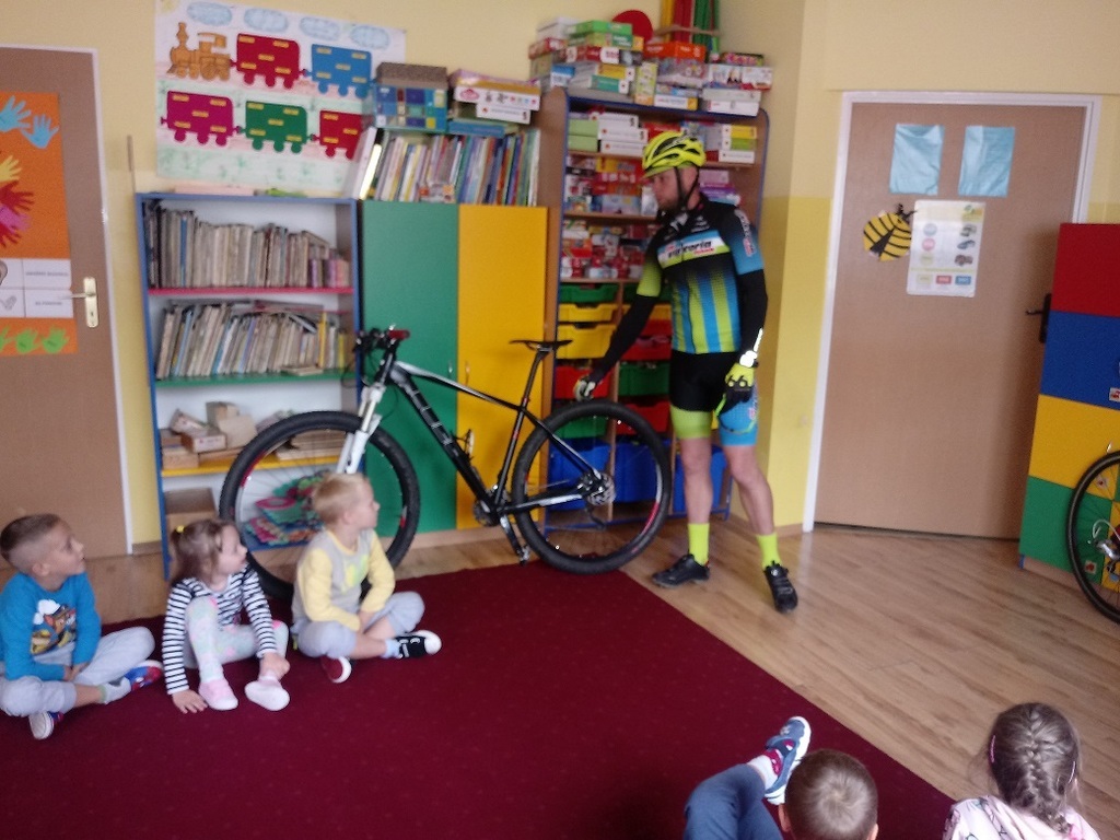 Tego samego dnia przedszkolaki spotkały się z kolarzem. Pan Marcin zaprezentował się dzieciom w stroju kolarza, pokazał swoje dwa rowery - górski i szosowy oraz opowiedział dzieciom o swojej pasji, jaką jest jazda na rowerze. Przedszkolaki z zaciekawieniem słuchały pogadanki, zadawały pytania i znajdowały różnice między zaprezentowanymi rowerami. Na zakończenie zajęć podziękowały panu Marcinowi i wręczyły laurkę.