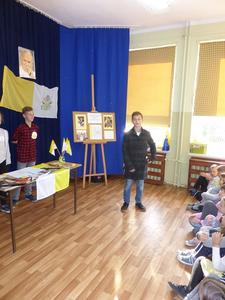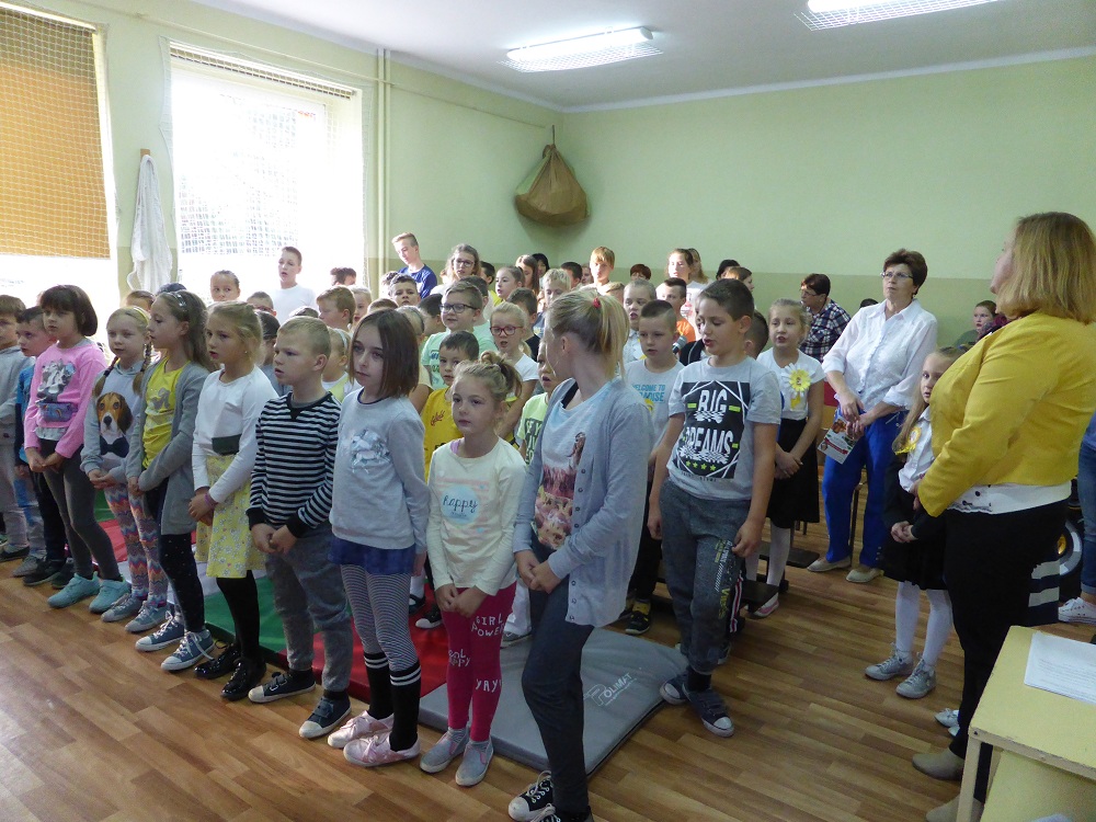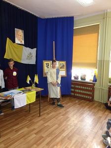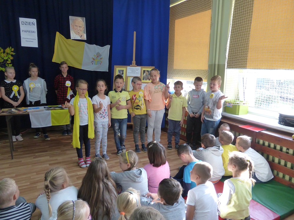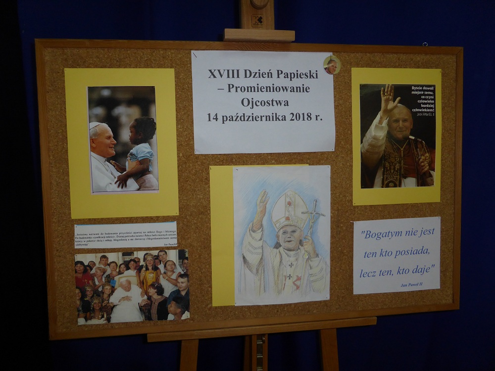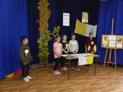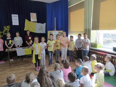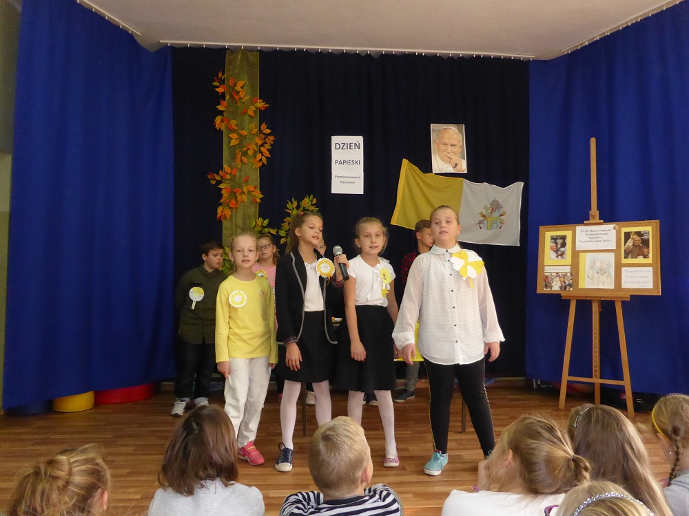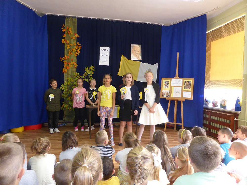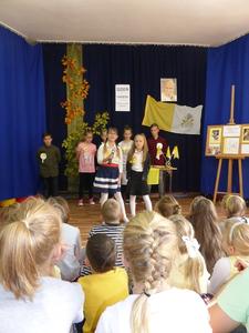 W naszej szkole uczniowie klasy V i VI podczas uroczystego apelu przedstawili inscenizację pod tytułem „Promieniowanie Ojcostwa”.