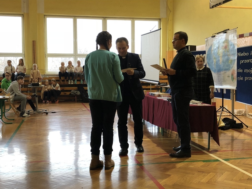 W czasieprac komisji konkursowej uczestnicy konkursu mogli zobaczyć prezentację o misjach przygotowaną przez siostrę misjonarkę z Raciborza, która również ciekawie opowiadała o pracy misjonarzy oraz wspólnie pośpiewać przy akompaniamencie gitar.