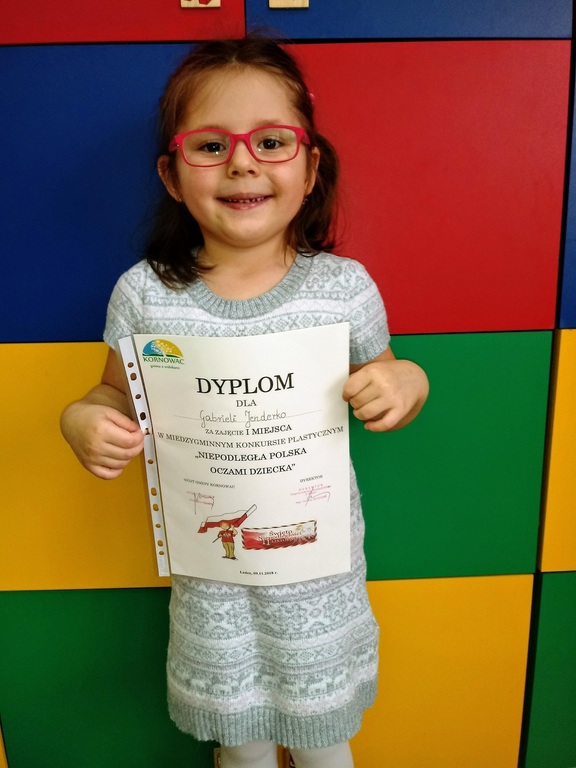 W listopadzie przedszkolaki z Rzuchowa wzięły udział w międzygminnym konkursie plastycznym "Niepodległa Polska oczami dziecka". Konkurs organizowany był przez Zespół Szkolno - Przedszkolny w Kobyli w ramach obchodów 100-lecia odzyskania przez Polskę niepodległości. Celem konkursu było: promowanie wiedzy na temat niepodległości naszej ojczyzny, zachęcanie dzieci do poznawania historii o Polsce i Polakach, uświadamianie, jak ważna jest ojczyzna, kształtowanie umiejętności plastycznych dzieci oraz kreowanie postawy twórczej przedszkolaka. Nasze przedszkole w grupie dzieci młodszych w tym konkursie reprezentowała Gabrysia Jenderko, która zdobyła pierwsze miejsce. Gratulujemy jej wygranej i życzymy dalszych sukcesów.