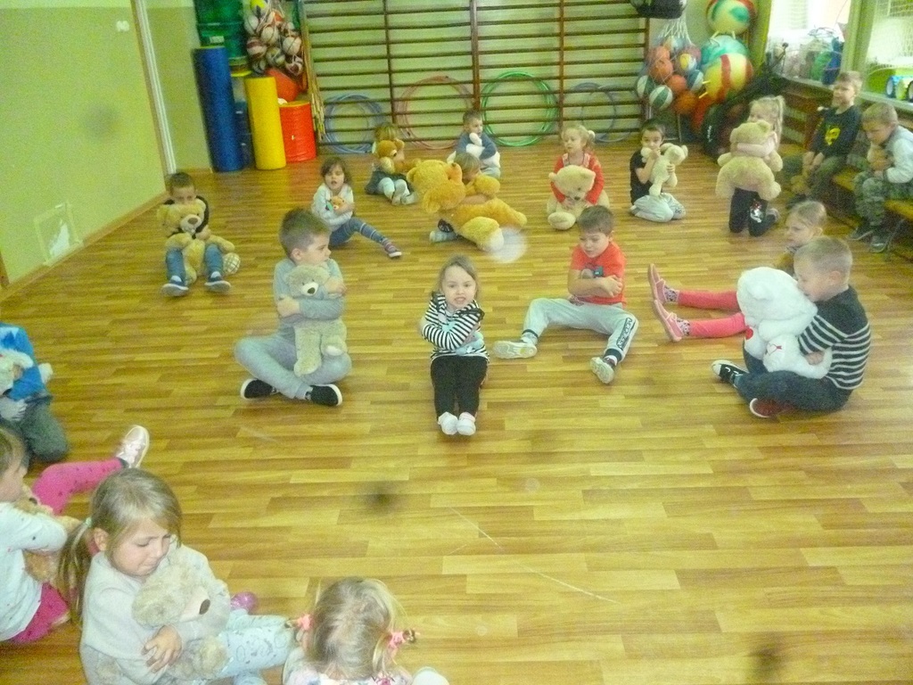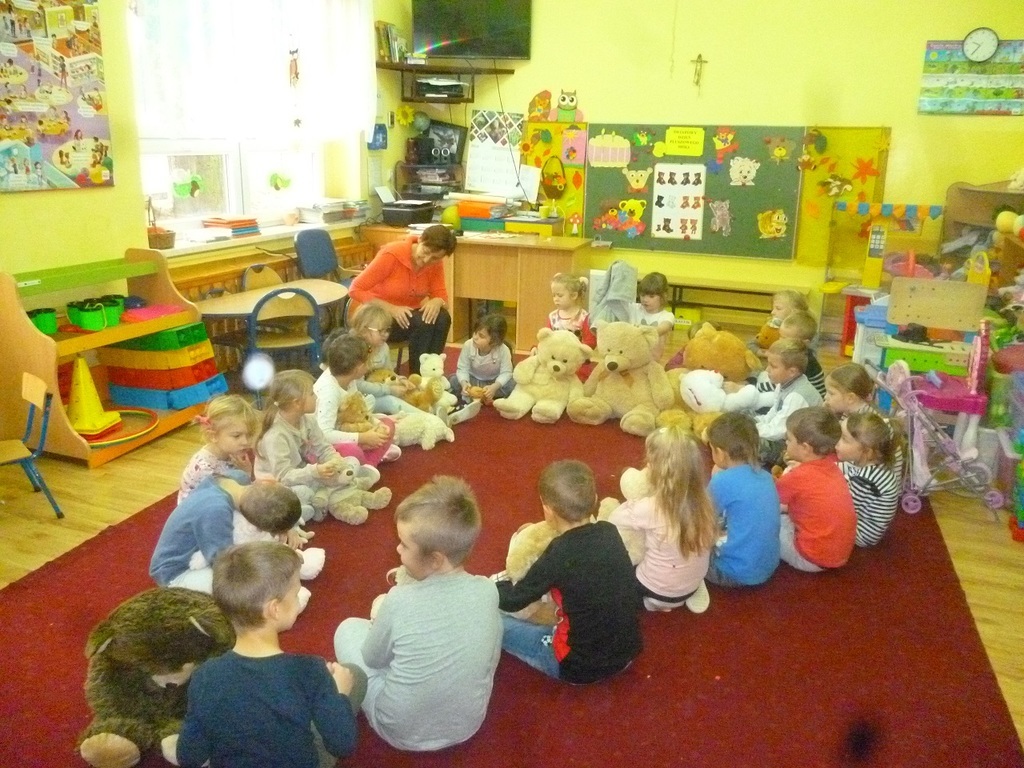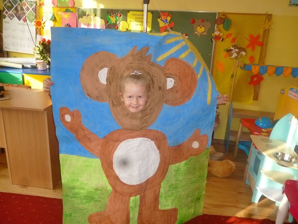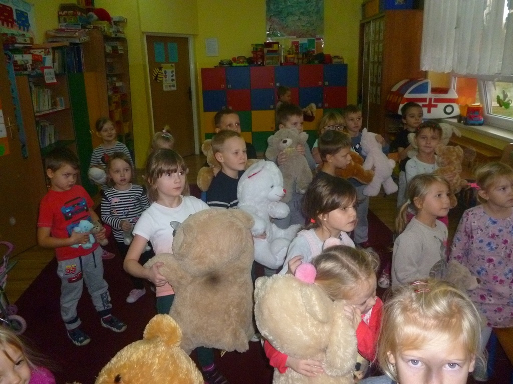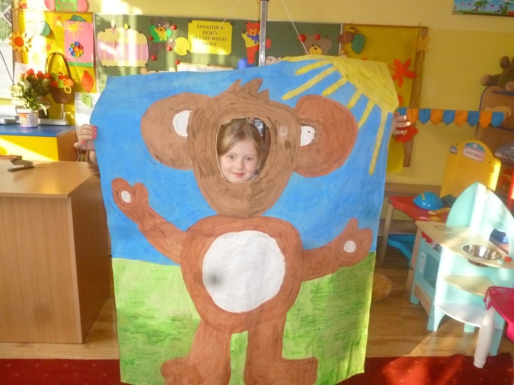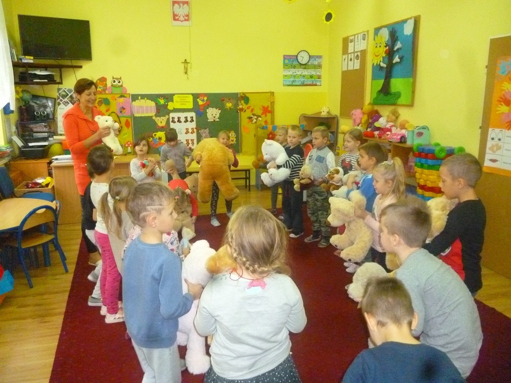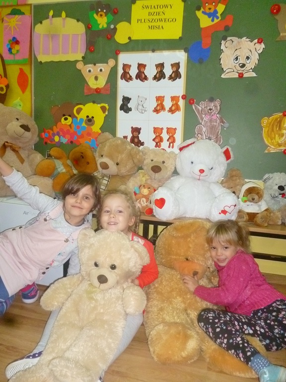 W związku ze Światowym Dniem Pluszowego Misia, który przypada 25 listopada, każde dziecko przyniosło do przedszkola swojego misia. W przedszkolu odbywało się wtedy dużo zabaw z pluszowymi niedźwiadkami. Przedszkolaki opowiedziały o swoich pluszakach, wysłuchały wiersza Cz Janczarskiego „ Naprawimy misia”, obejrzały bajki o misiach, m.in.: „Miś Uszatek”, „Miś Kudłatek” oraz bawiły się przy piosence „Jadą, jadą misie” i „Stary niedźwiedź mocno śpi”. Wczuwały się w role smutnych i wesołych misiów, porównywały pod względem koloru i wielkości oraz przeliczały. Ponadto każdy przedszkolak namalował misia oraz uczestniczył w wielu ciekawych zabawach ruchowych na sali gimnastycznej. Ten dzień upłynął nam w radosnej atmosferze oraz dostarczył wszystkim wielu niezapomnianych wrażeń tym bardziej że dzieci mogły sobie zrobić zabawne „misiowe” zdjęcie.