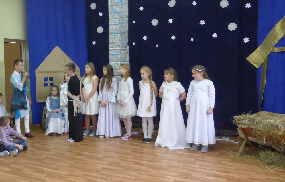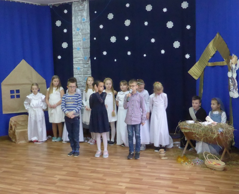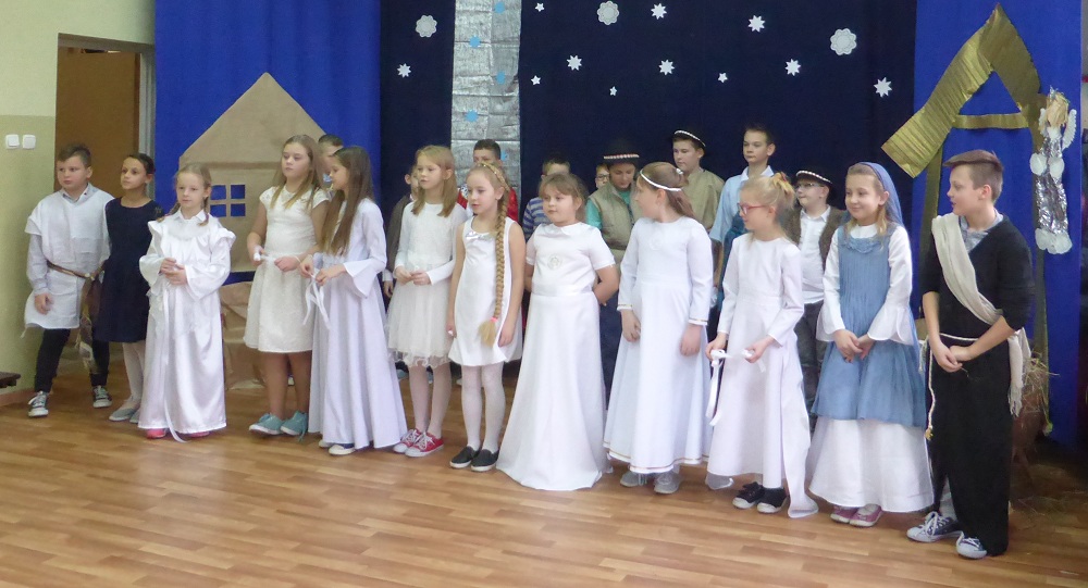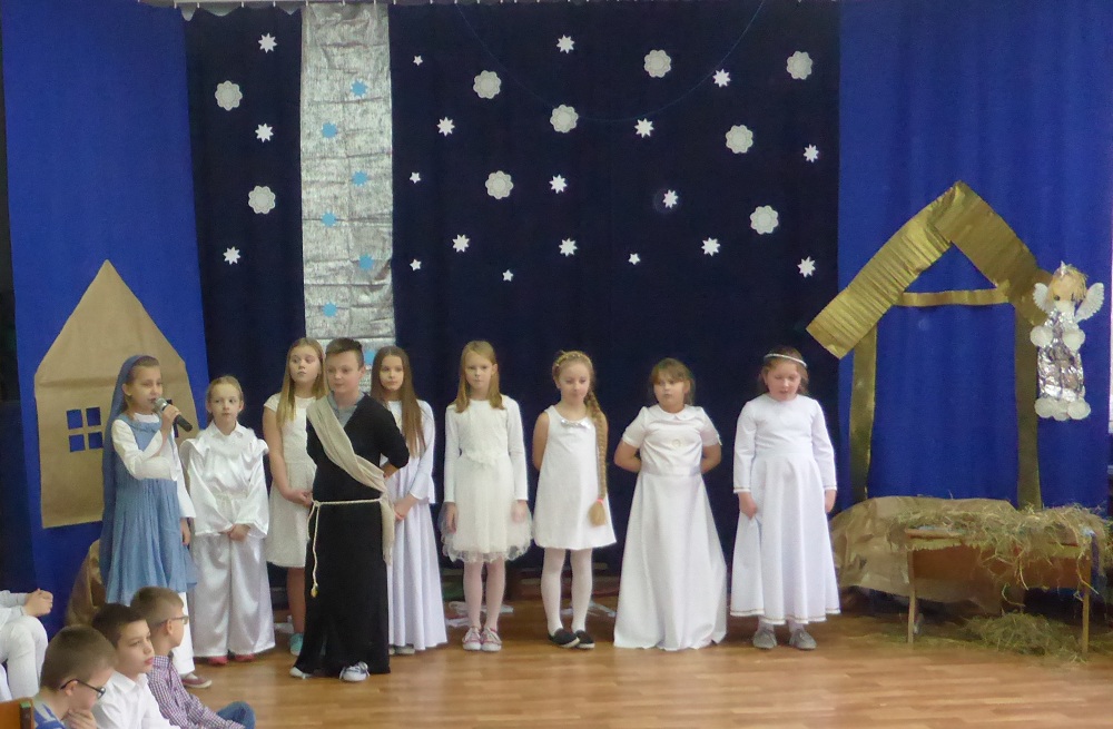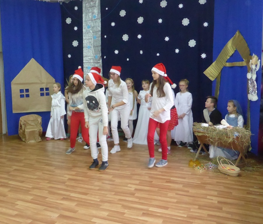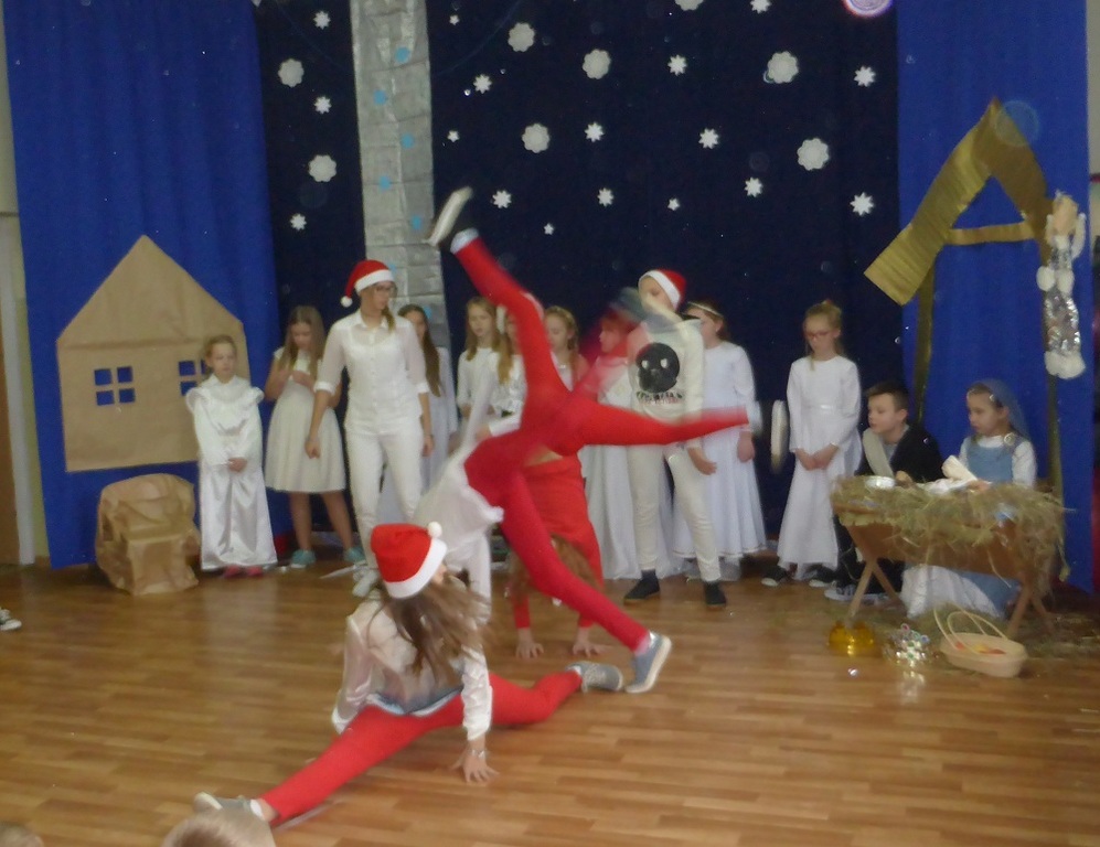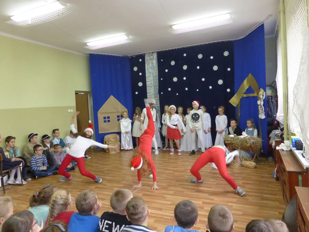 Historia narodzin Pana Jezusa została tradycyjnie osadzona w czasach starożytnych. Główni bohaterowie jasełek to Maryja i Józef oraz aniołowie, a także pasterze i mędrcy. Uczniowie klasy IV z pomocą swoich starszych kolegów z wielkim przejęciem odgrywali swoje role i starali się przekonać licznie zgromadzoną widownię co jest istotą Bożego Narodzenia. Przedstawienie wzbogacił taniec wykonany przez zespół taneczny pod kierunkiem Jakuba Mrozka z klasy VI. Na zakończenie Pani dyrektor podziękowała młodym artystom za przygotowanie wyjątkowych jasełek, a także złożyła świąteczne życzenia przybyłym na uroczystość uczniom, nauczycielom i wszystkim pracownikom szkoły.
