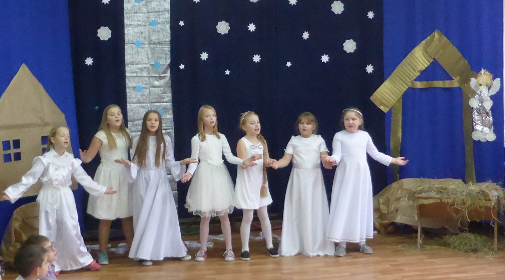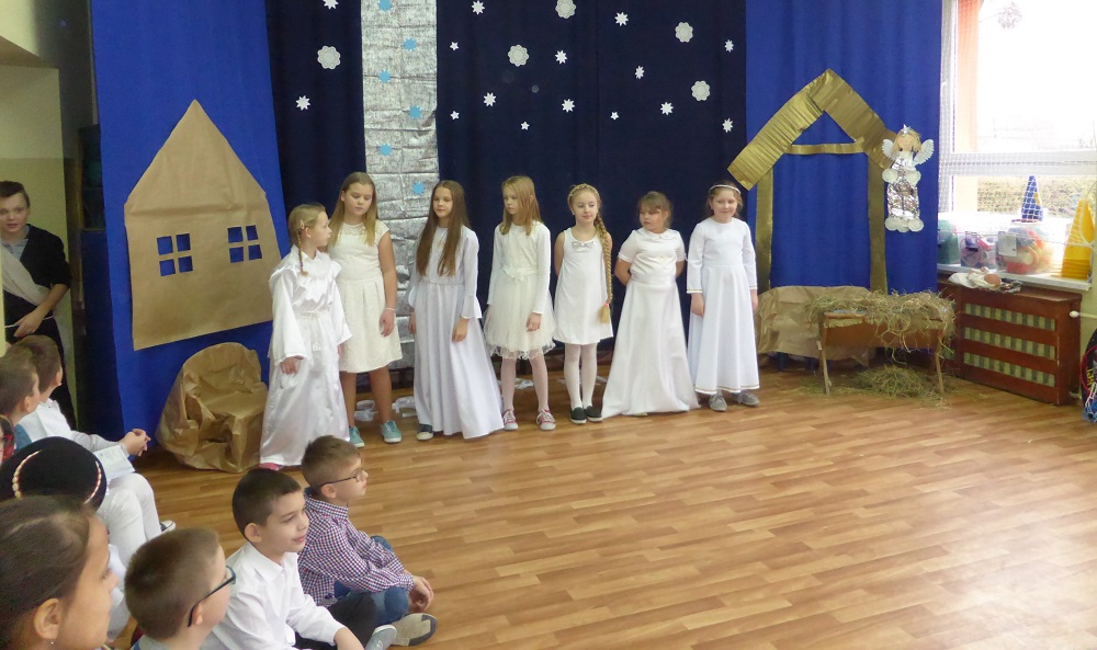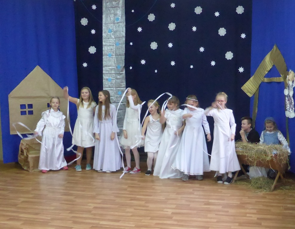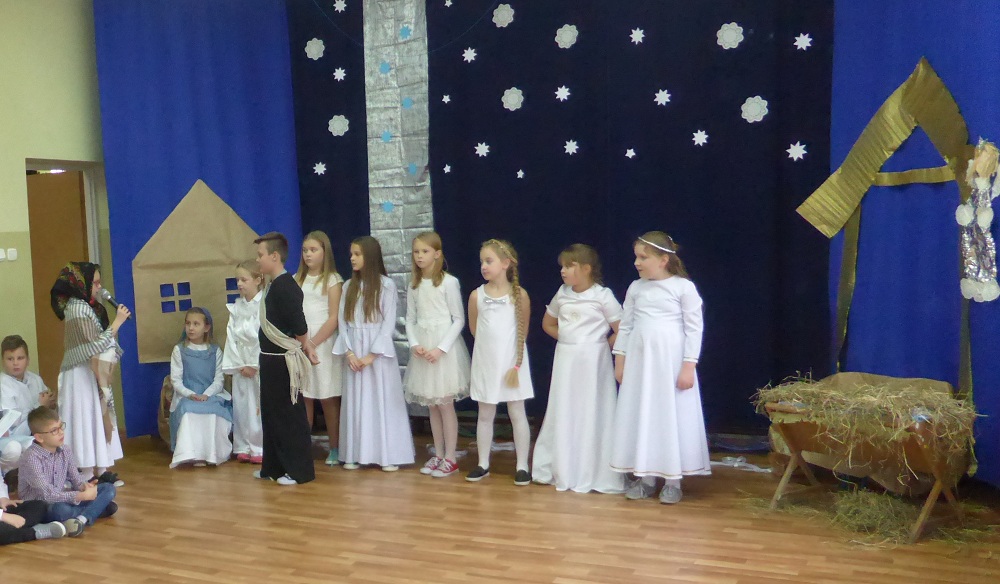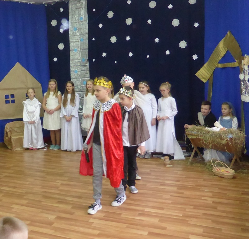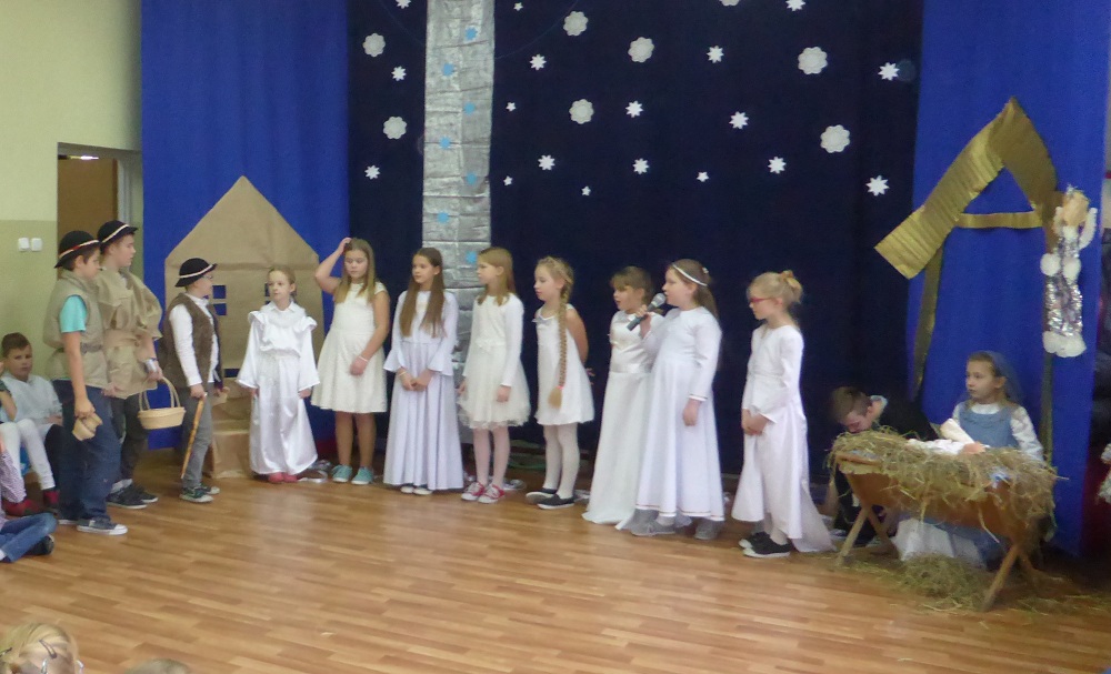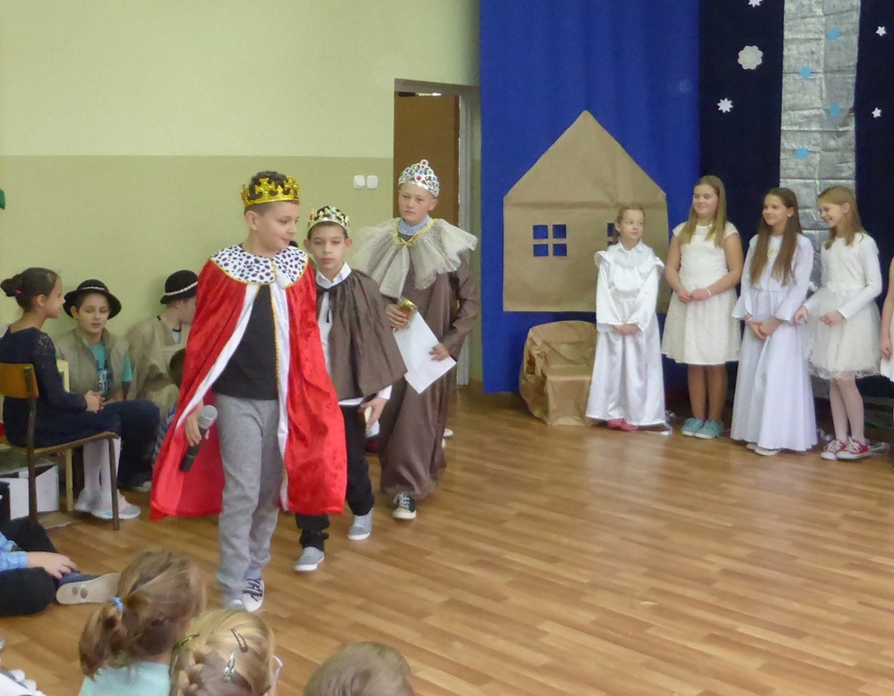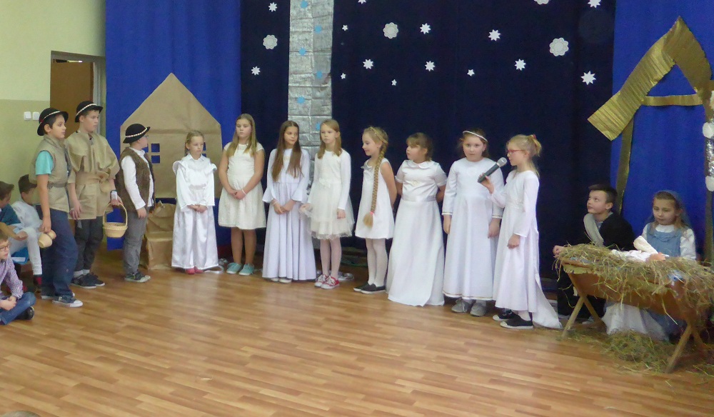 Historia narodzin Pana Jezusa została tradycyjnie osadzona w czasach starożytnych. Główni bohaterowie jasełek to Maryja i Józef oraz aniołowie, a także pasterze i mędrcy. Uczniowie klasy IV z pomocą swoich starszych kolegów z wielkim przejęciem odgrywali swoje role i starali się przekonać licznie zgromadzoną widownię co jest istotą Bożego Narodzenia. Przedstawienie wzbogacił taniec wykonany przez zespół taneczny pod kierunkiem Jakuba Mrozka z klasy VI. Na zakończenie Pani dyrektor podziękowała młodym artystom za przygotowanie wyjątkowych jasełek, a także złożyła świąteczne życzenia przybyłym na uroczystość uczniom, nauczycielom i wszystkim pracownikom szkoły.