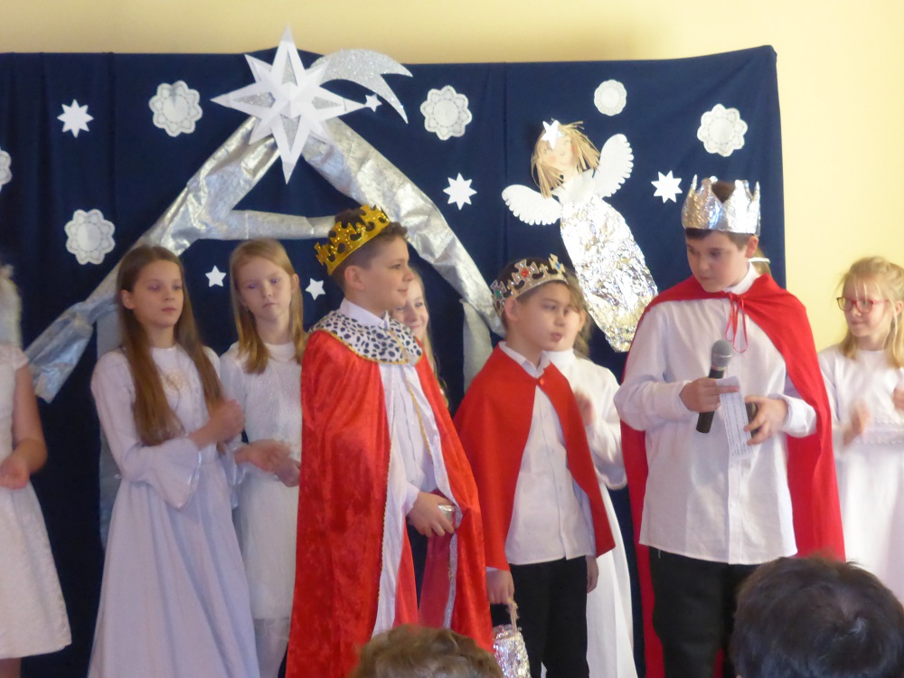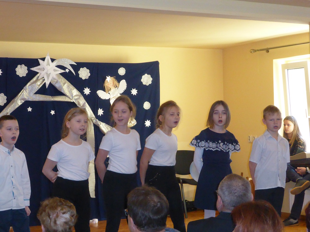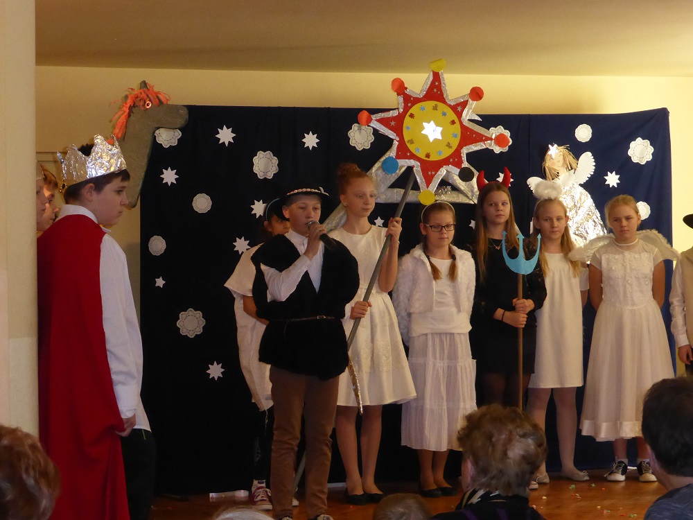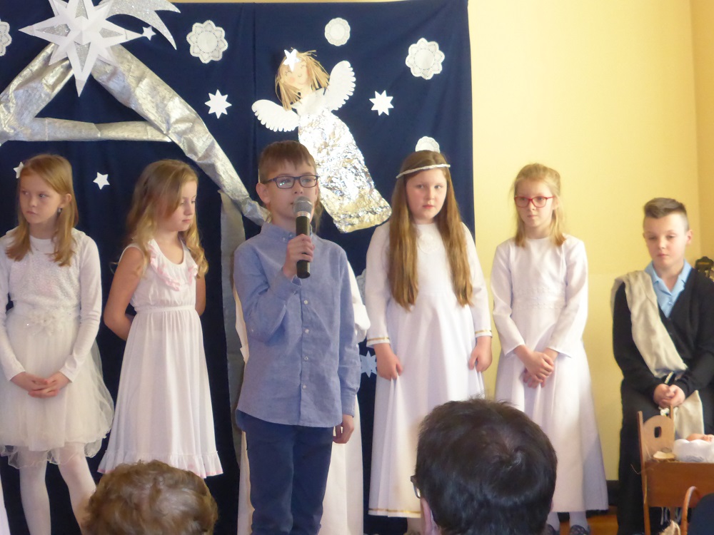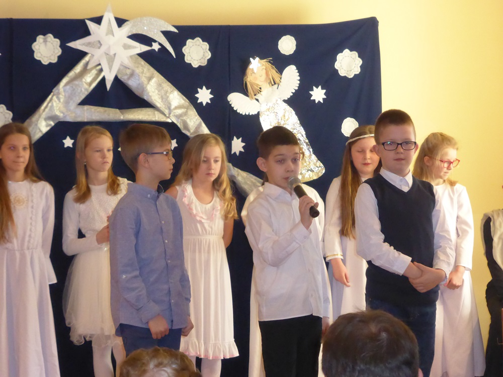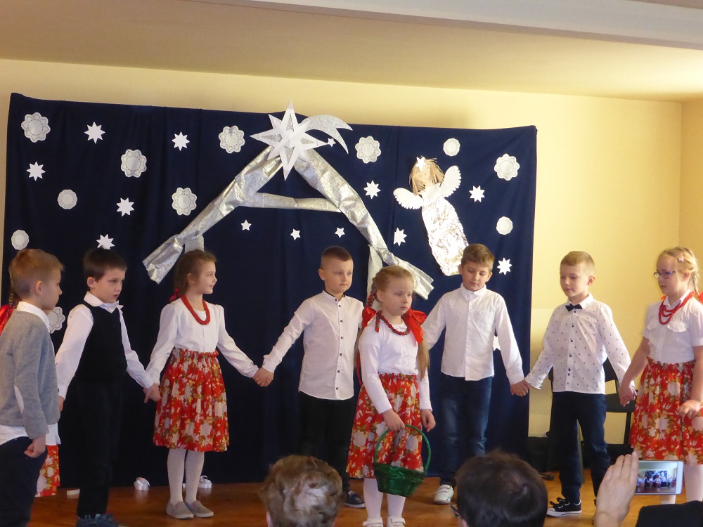 Dzień Babci i Dziadka to jedno z ważniejszych świąt i stały punkt w repertuarze imprez naszej szkoły. Styczeń to także czas, kiedy rozbrzmiewają kolędy, noworoczne pastorałki i nastój świąt jeszcze trwa. I właśnie w tym klimacie przygotowaliśmy dzisiejszą uroczystość. Wszystkim wiadomo, że Babcia i Dziadek to osoby, które pełnią istotną rolę dla wszystkich wnuków - bo kto, jak nie Dziadkowie, pocieszy, przytuli, doradzi czy uściśnie? Tak zacnych gości nie mogło zabraknąć dziś w naszej szkole. Liczne grono zaproszonych Dziadków zasiadło przy stołach zastawionych słodkim poczęstunkiem, przygotowanym przez Radę Rodziców. Pani Dyrektor rozpoczęła uroczystość i zaprosiła do obejrzenia programu, a prowadzący w klimacie nastrojowej kolędy godnie powitali zebranych i zaprosili do wspólnej zabawy. Dziadkowie mogli oglądać występy swoich wnuków w licznych kolędach, pastorałkach, przedstawieniu ,,Jasełek"oraz korowodzie kolędników. Program przeplatany był ciekawymi układami tanecznymi i solowymi występami dzieci, grających na instrumentach muzycznych. Zebrani z dumą oglądali i podziwiali swoich wnuków dziękując za występy licznymi oklaskami. Na twarzach gości było widać podziw, radość i wzruszenie. Dziękujemy wszystkim za udział, rodzicom za przygotowanie poczęstunku, a dzieciom za wspaniałe występy w programie. Było to miłe i sympatyczne spotkanie w świątecznej atmosferze. Impreza należała do udanych, a uśmiech i frekwencja były tego dowodem.