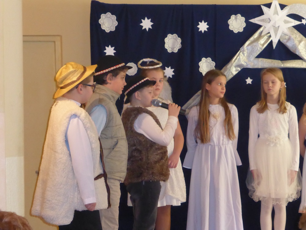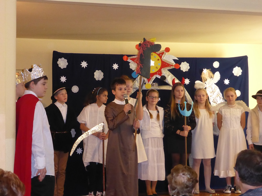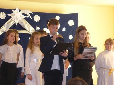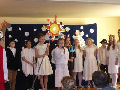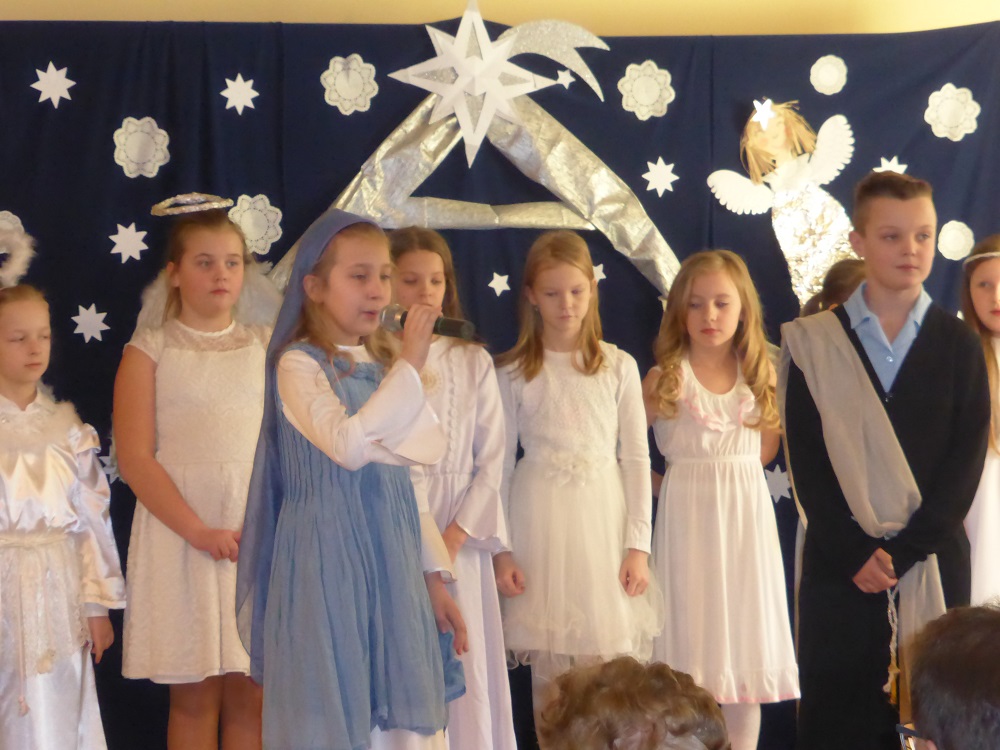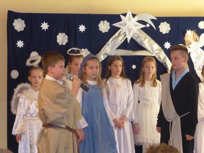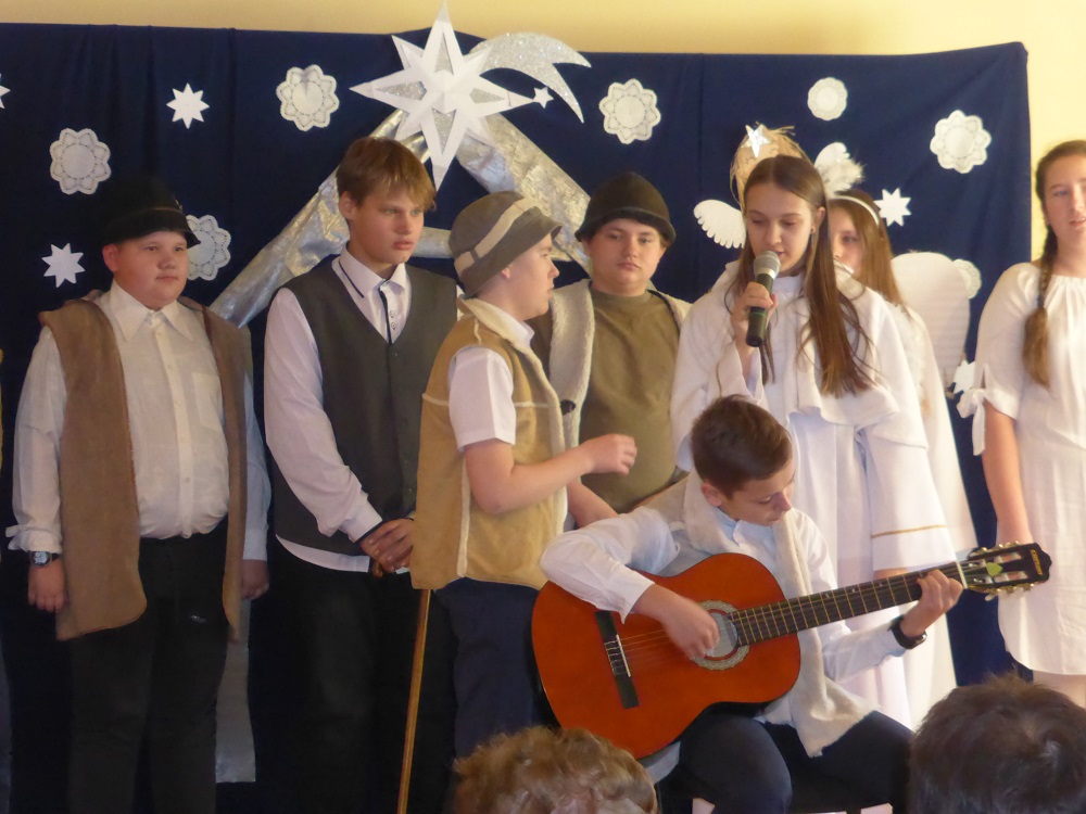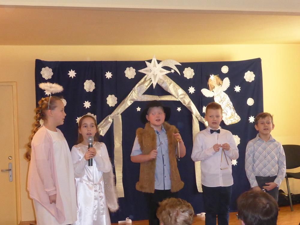 Dzień Babci i Dziadka to jedno z ważniejszych świąt i stały punkt w repertuarze imprez naszej szkoły. Styczeń to także czas, kiedy rozbrzmiewają kolędy, noworoczne pastorałki i nastój świąt jeszcze trwa. I właśnie w tym klimacie przygotowaliśmy dzisiejszą uroczystość. Wszystkim wiadomo, że Babcia i Dziadek to osoby, które pełnią istotną rolę dla wszystkich wnuków - bo kto, jak nie Dziadkowie, pocieszy, przytuli, doradzi czy uściśnie? Tak zacnych gości nie mogło zabraknąć dziś w naszej szkole. Liczne grono zaproszonych Dziadków zasiadło przy stołach zastawionych słodkim poczęstunkiem, przygotowanym przez Radę Rodziców. Pani Dyrektor rozpoczęła uroczystość i zaprosiła do obejrzenia programu, a prowadzący w klimacie nastrojowej kolędy godnie powitali zebranych i zaprosili do wspólnej zabawy. Dziadkowie mogli oglądać występy swoich wnuków w licznych kolędach, pastorałkach, przedstawieniu ,,Jasełek"oraz korowodzie kolędników. Program przeplatany był ciekawymi układami tanecznymi i solowymi występami dzieci, grających na instrumentach muzycznych. Zebrani z dumą oglądali i podziwiali swoich wnuków dziękując za występy licznymi oklaskami. Na twarzach gości było widać podziw, radość i wzruszenie. Dziękujemy wszystkim za udział, rodzicom za przygotowanie poczęstunku, a dzieciom za wspaniałe występy w programie. Było to miłe i sympatyczne spotkanie w świątecznej atmosferze. Impreza należała do udanych, a uśmiech i frekwencja były tego dowodem.
