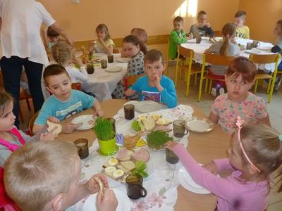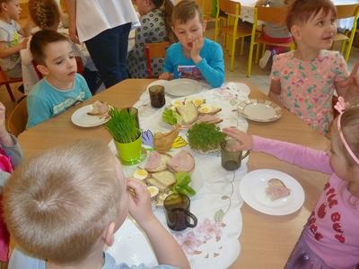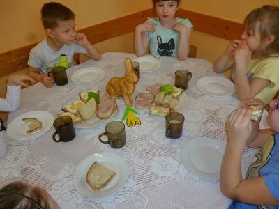 Pełno na nim potraw: kiełbasa i żurek, baba lukrowana, tuż obok mazurek...