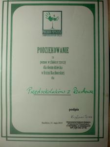 W dniach od 27 do 31 maja w naszym przedszkolu odbyła się zbiórka artykułów dla wychowanków domu dziecka w Kuźni Raciborskiej. Zebrane dary (artykuły szkolne, kosmetyki oraz rzeczy do wystroju wnętrz) przekazaliśmy do Stowarzyszenia Artystyczno- Społecznego "Pracownia Przyszłości", które było organizatorem zbiórki. Dziękujemy przedszkolakom i rodzicom za zaangażowanie w akcję charytatywną.