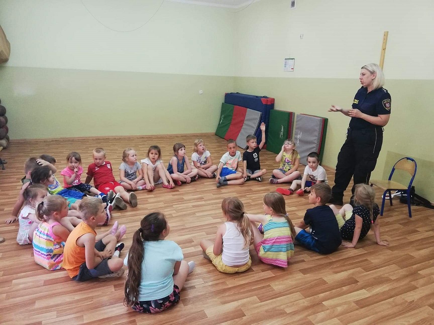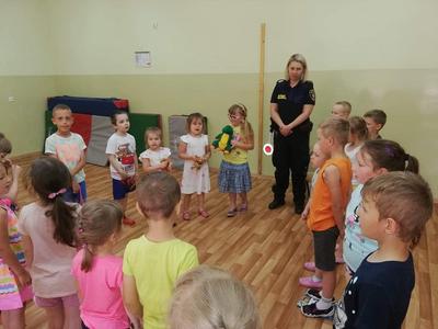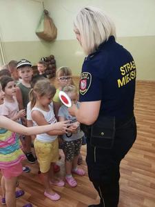 12 czerwca gościliśmy w naszym przedszkolu Strażników Miejskich. Podczas tego spotkania dzieci uczestniczyły w pogadance dotyczącej przestrzegania zasad bezpieczeństwa podczas wakacji. Dzieci poznały zasady bezpiecznego zachowania na kąpieliskach, dowiedziały się, że podczas jazdy na rowerze należy mieć na głowie kask ochronny, że w górach i lesie trzeba zachować ciszę oraz nie śmiecić oraz jak należy się zachować w kontakcie z obcym psem. Dzieci przypomniały sobie numery telefonów alarmowych, dowiedziały się, że powinny znać imię i nazwisko oraz swój adres w razie gdy się zgubią. Ale bardzo ważne jest, aby zawsze przebywały pod opieką rodziców.